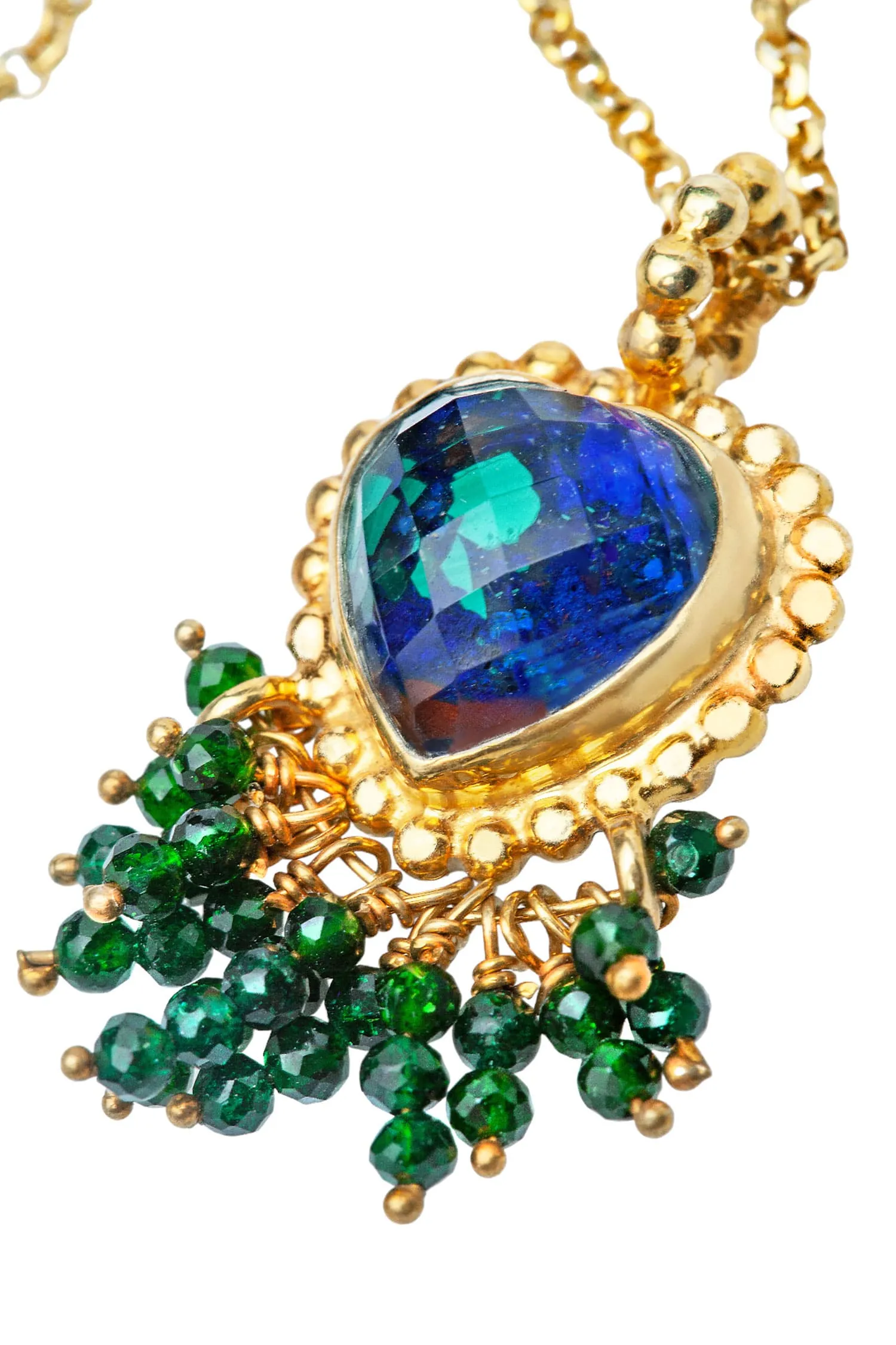 Αυτό το εντυπωσιακό κολιέ με μαλαχίτη και αζουρίτη είναι η τέλεια προσθήκη στη συλλογή κοσμημάτων σας! Φτιαγμένο με επιχρυσωμένο ασήμι 925, το κολιέ αυτό διαθέτει ένα όμορφο, λεπτοδουλεμένο σχήμα καρδιάς μενταγιόν που περιλαμβάνει τους δύο εκθαμβωτικούς λίθους. Ο αζουρίτης έχει ένα βαθύ και πλούσιο μπλε χρώμα, ενώ ο μαλαχίτης ένα βαθύ και ζωηρό πράσινο. Μαζί, αυτοί οι λίθοι δημιουργούν ένα εντυπωσιακό αντίθεση χρωμάτων που θα τραβήξει την προσοχή. Αυτό το κολιέ είναι ο τέλειος τρόπος για να προσθέσετε λάμψη και κομψότητα σε κάθε σύνολο.