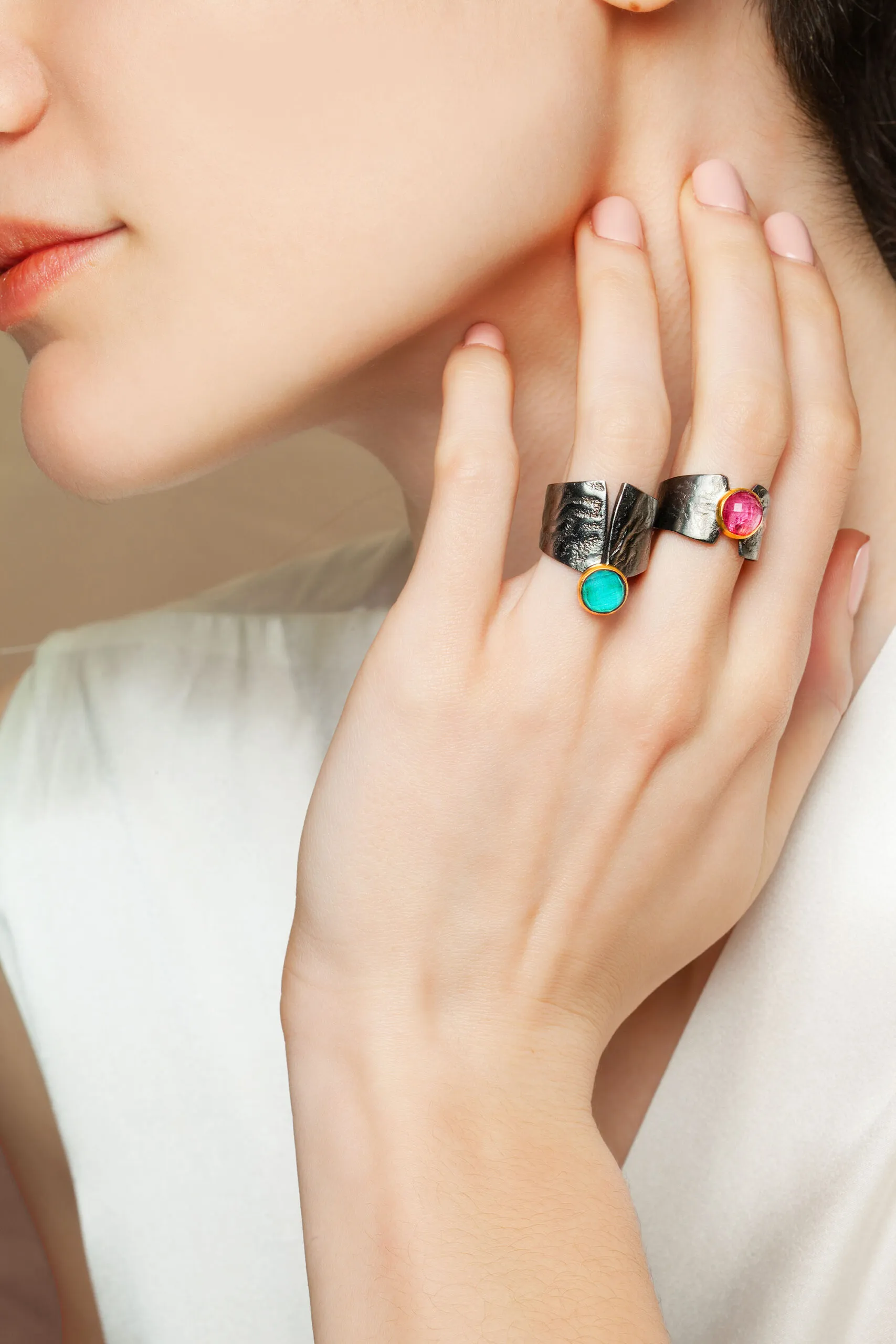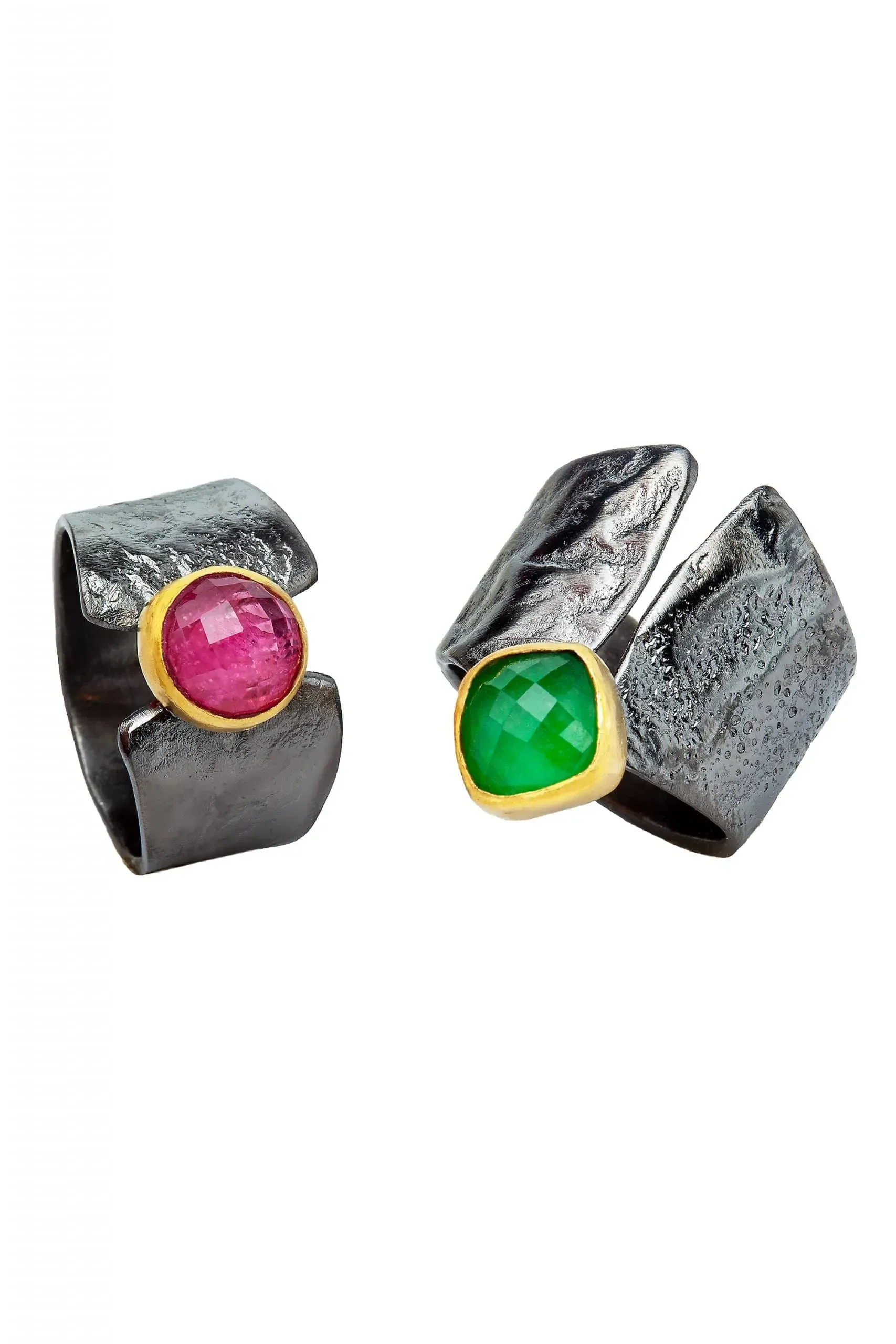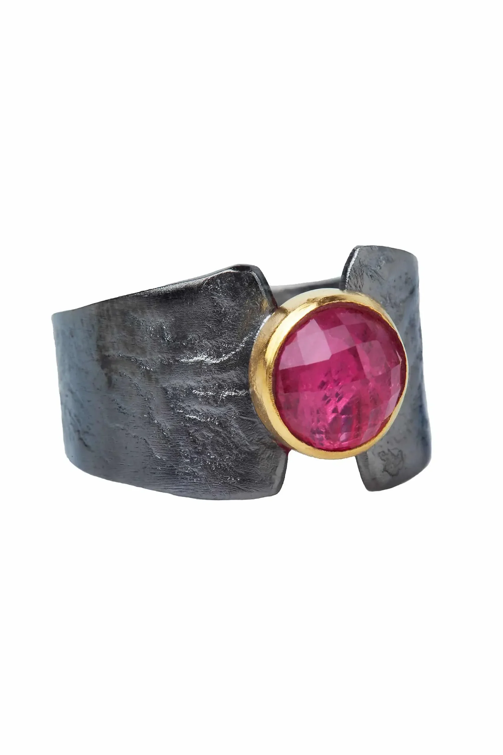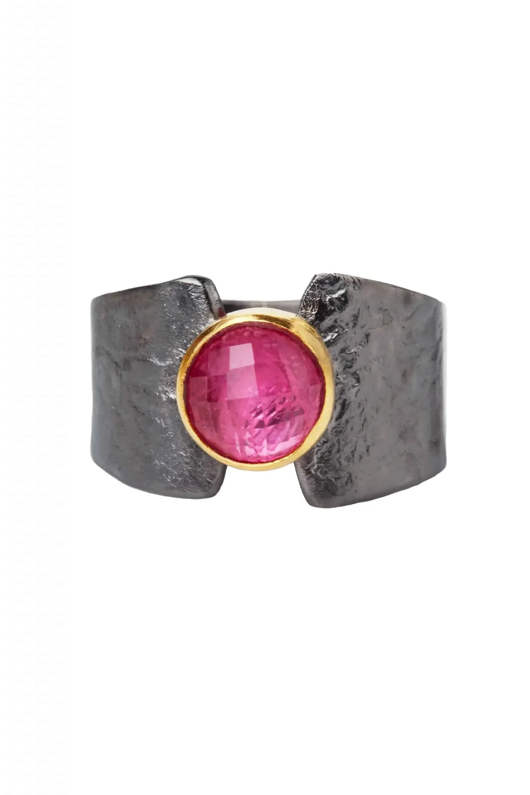Ασημένιο δαχτυλίδι με ρουμπίνι, μαύρη επιπλατίνωση και επίχρυση λεπτομέρεια γύρω από την πέτρα