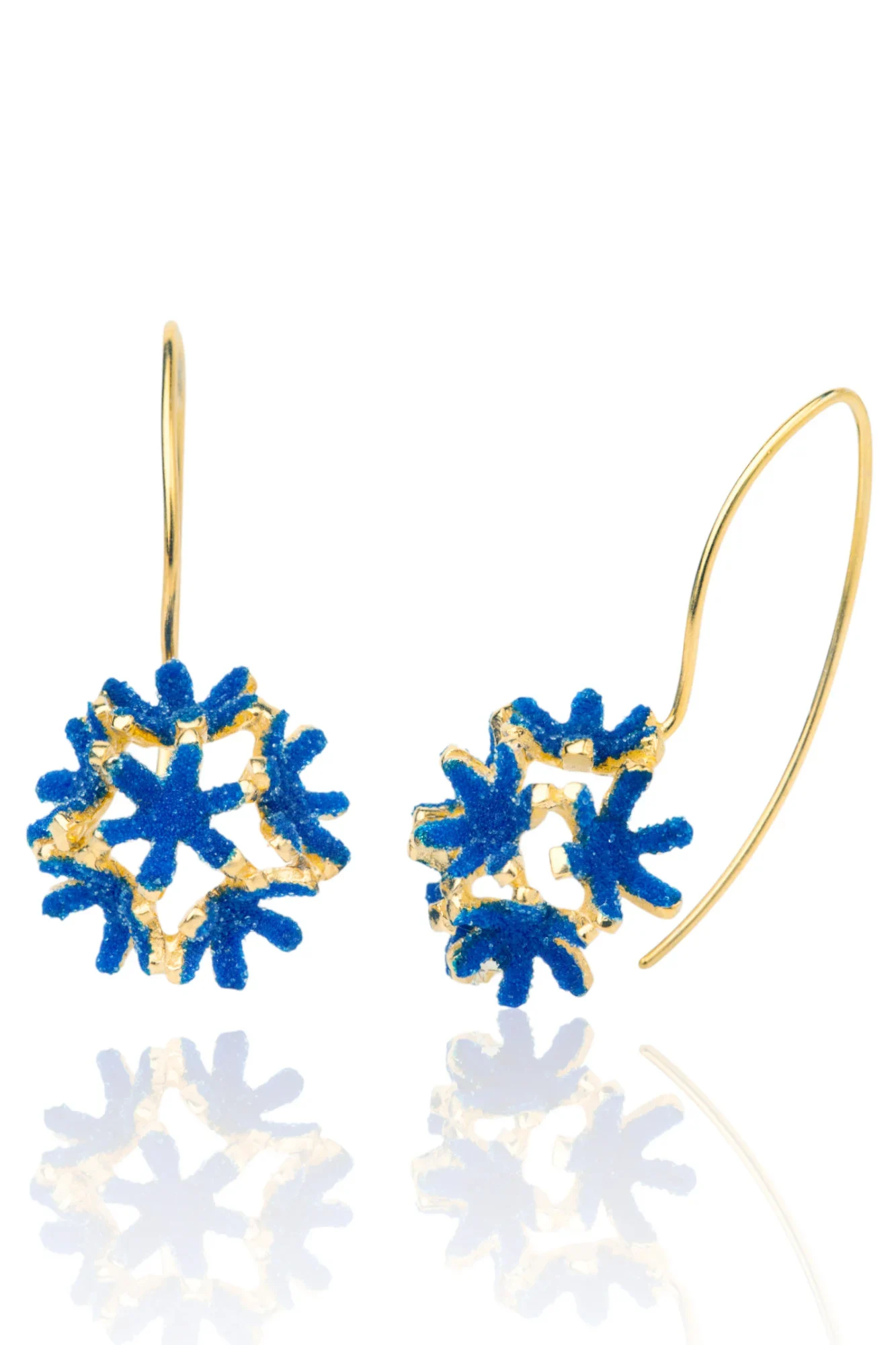 Χειροποίητα με αγάπη και ακρίβεια, αυτά τα σκουλαρίκια είναι κατασκευασμένα από επιχρυσωμένο ασήμι 18 καρατίων και διακοσμημένα με λαμπερούς μπλε νανοκρυστάλλους, προσθέτοντας κομψότητα και λάμψη σε κάθε εμφάνιση.