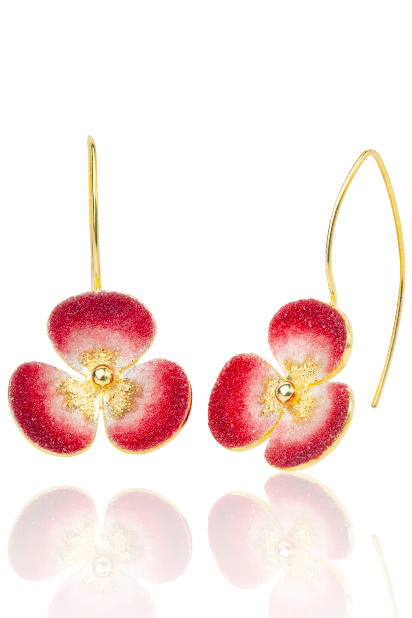 Κατασκευασμένα με αγάπη και απόλυτη προσοχή στη λεπτομέρεια, αυτά τα σκουλαρίκια διαθέτουν περίτεχνα επιχρυσωμένα ασημένια πέταλα, διακοσμημένα με ζωηρούς κόκκινους και λευκούς νανοκρυστάλλους, δημιουργώντας ένα μαγευτικό σχέδιο.