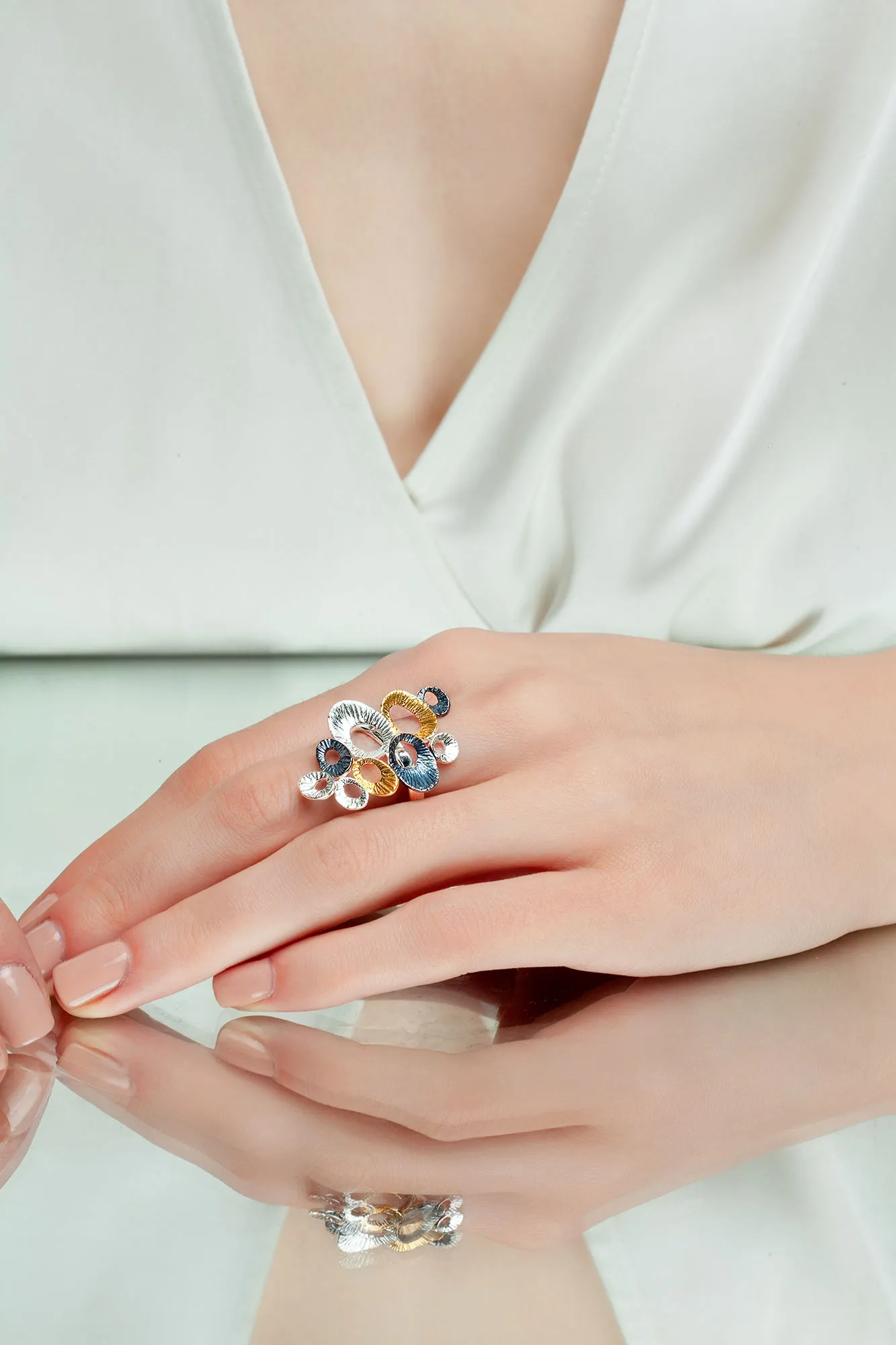 Παρουσιάζουμε το εντυπωσιακό μας Μίνιμαλ Γεωμετρικό Χειροποίητο Ασημένιο Δαχτυλίδι με Πολλαπλές Επιμεταλλώσεις! Δημιουργημένο με απόλυτη ακρίβεια και πάθος, αυτό το δαχτυλίδι είναι ένα αληθινό αριστούργημα. Ο κομψός και μοντέρνος σχεδιασμός του διαθέτει πολλές ασημένιες φόρμες, δημιουργώντας ένα μοναδικό γεωμετρικό μοτίβο που σίγουρα θα τραβήξει την προσοχή. Ο ρυθμιζόμενος δακτύλιος εξασφαλίζει τέλεια εφαρμογή για κάθε μέγεθος δακτύλου, καθιστώντας το ένα ευέλικτο αξεσουάρ για κάθε περίσταση. Φτιαγμένο από υλικά υψηλής ποιότητας, αυτό το δαχτυλίδι είναι ανθεκτικό και μακράς διάρκειας, κάνοντάς το μια σοφή επένδυση για τη συλλογή κοσμημάτων σας. Ιδανικό τόσο για καθημερινή όσο και για επίσημη χρήση, αυτό το δαχτυλίδι θα προσθέσει μια πινελιά κομψότητας και εκλεπτυσμένου στυλ σε κάθε εμφάνιση. Αναβαθμίστε το στυλ σας με το Μίνιμαλ Γεωμετρικό Χειροποίητο Ασημένιο Ρυθμιζόμενο Δαχτυλίδι μας. Αγοράστε τώρα και κάντε μια δήλωση με το δικό σας στυλ.