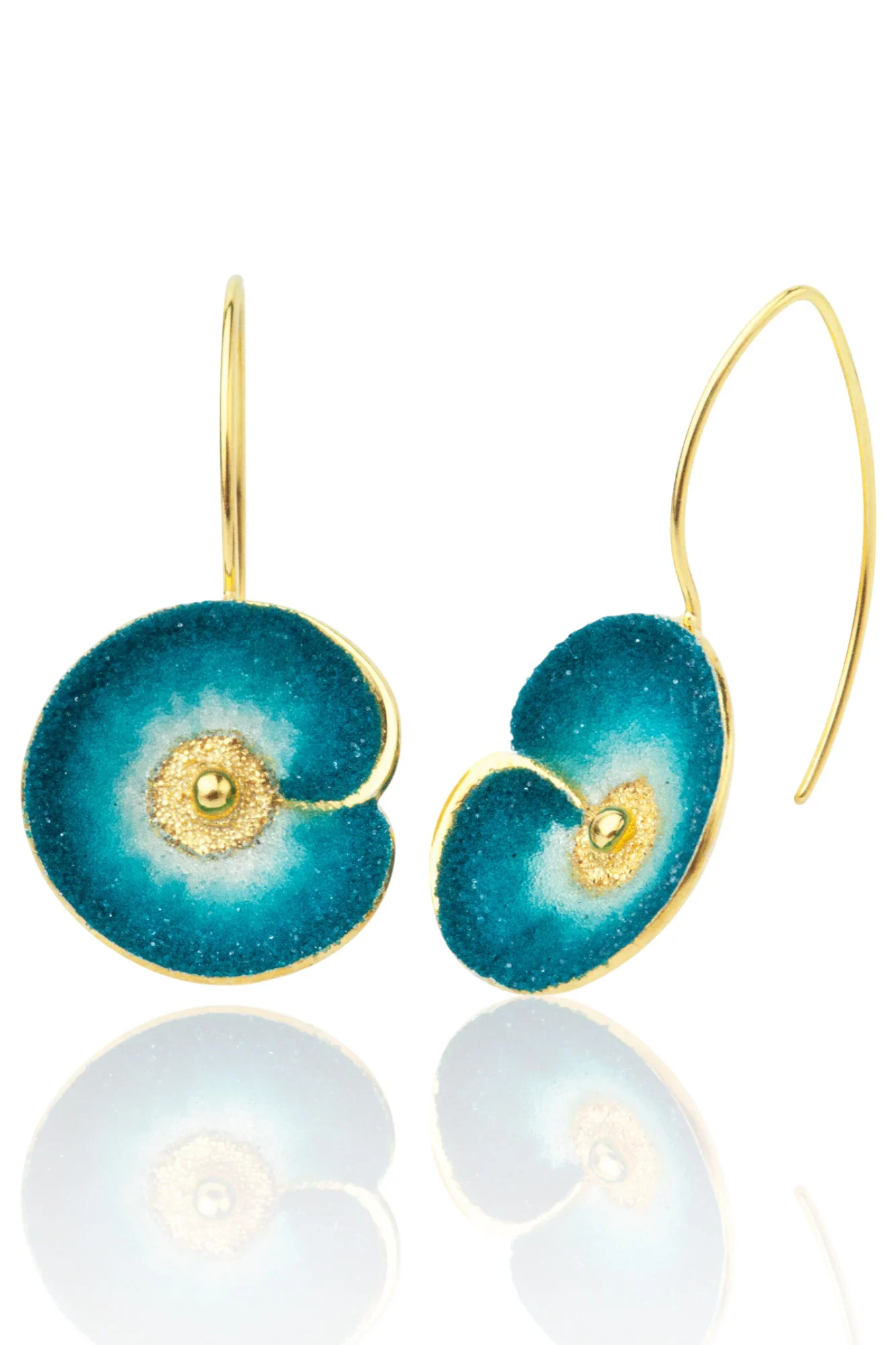 Κάθε σκουλαρίκι διαθέτει περίτεχνα Λουλούδια από ασήμι επιχρυσωμένο υψηλής ποιότητας, στολισμένα με εκθαμβωτικούς λευκούς και τουρκουάζ νανοκρυστάλλους. Κατασκευασμένα στο χέρι με απόλυτη ακρίβεια και προσοχή στη λεπτομέρεια, αποτελούν ένα πραγματικά μοναδικό κόσμημα.