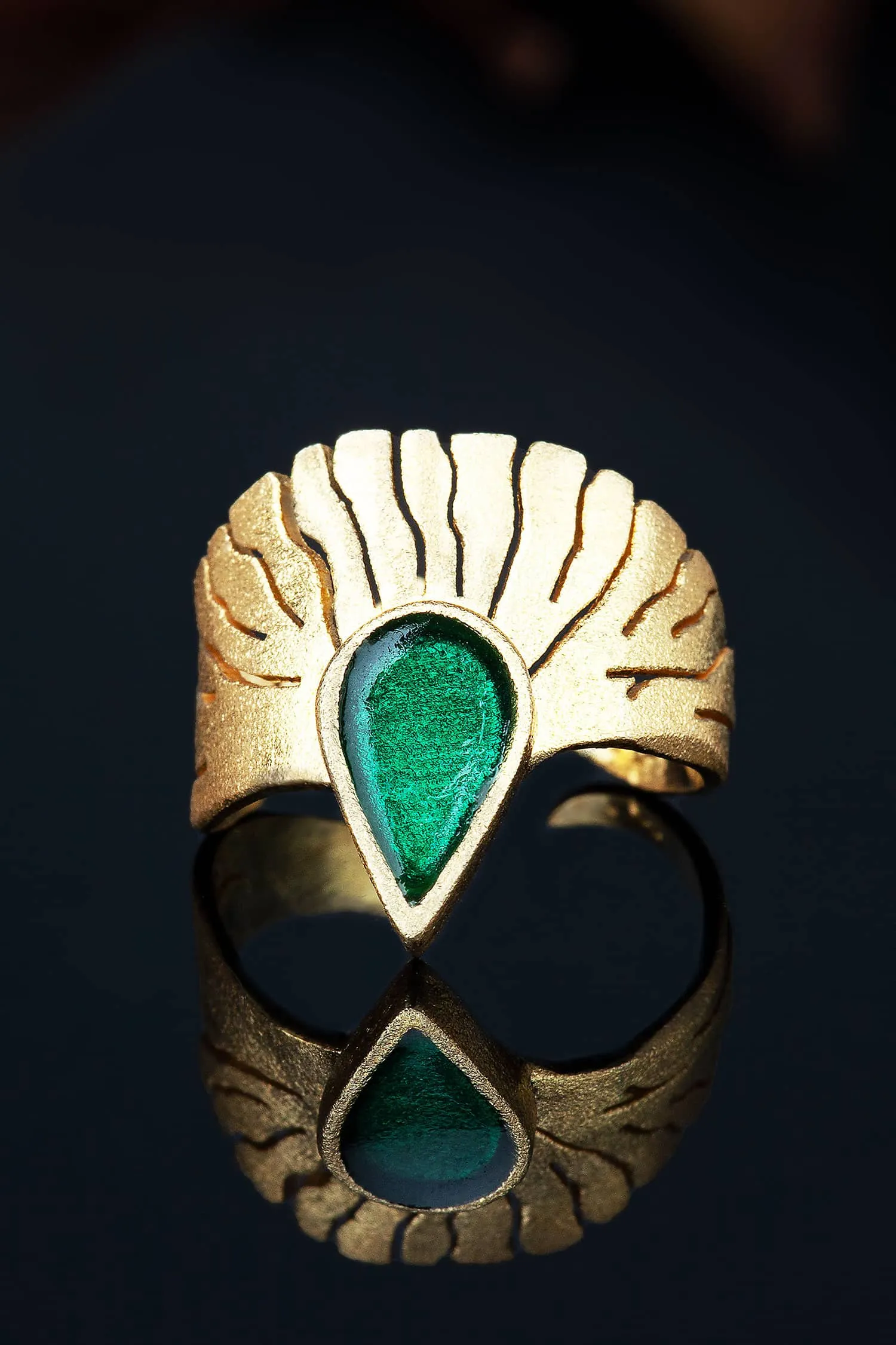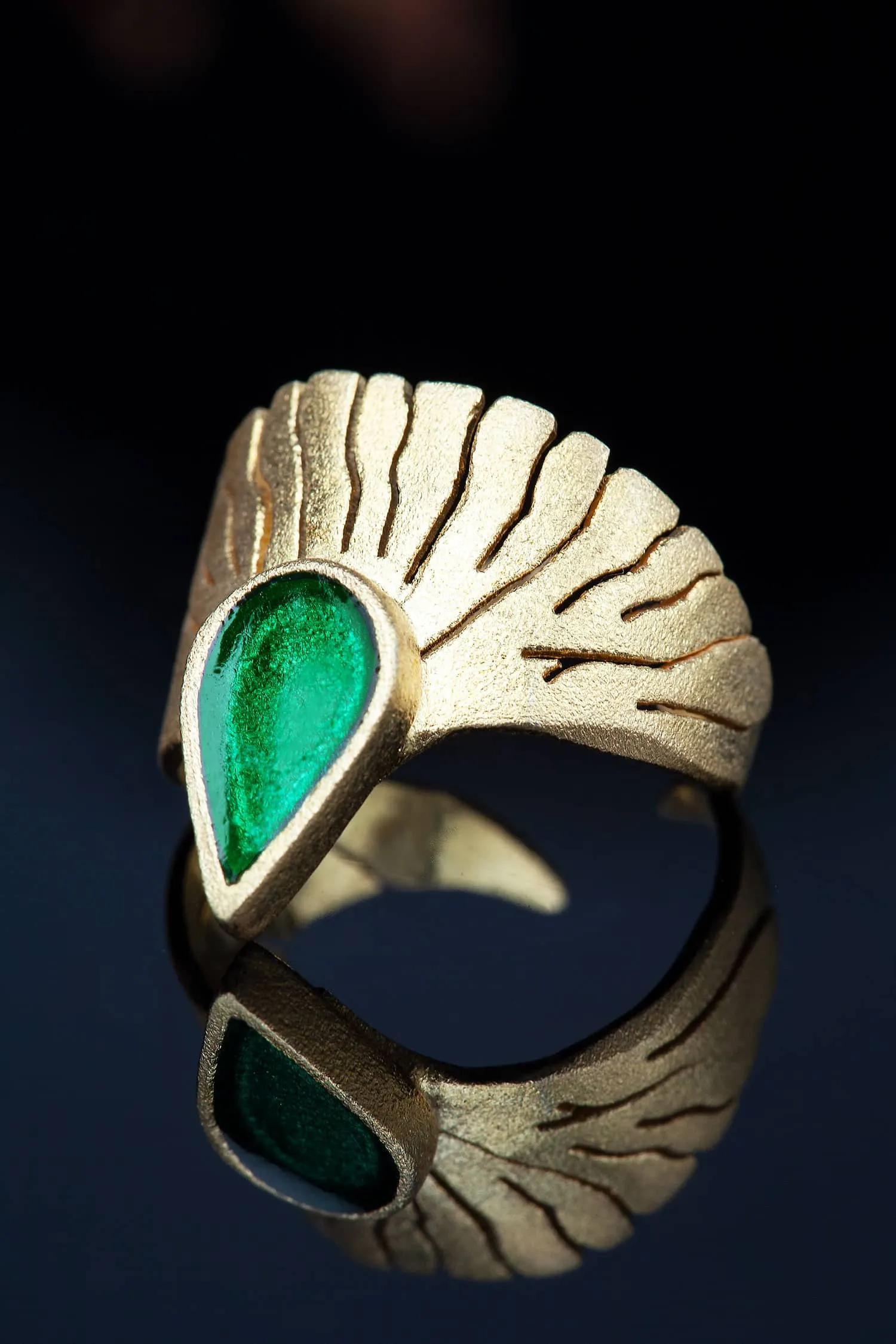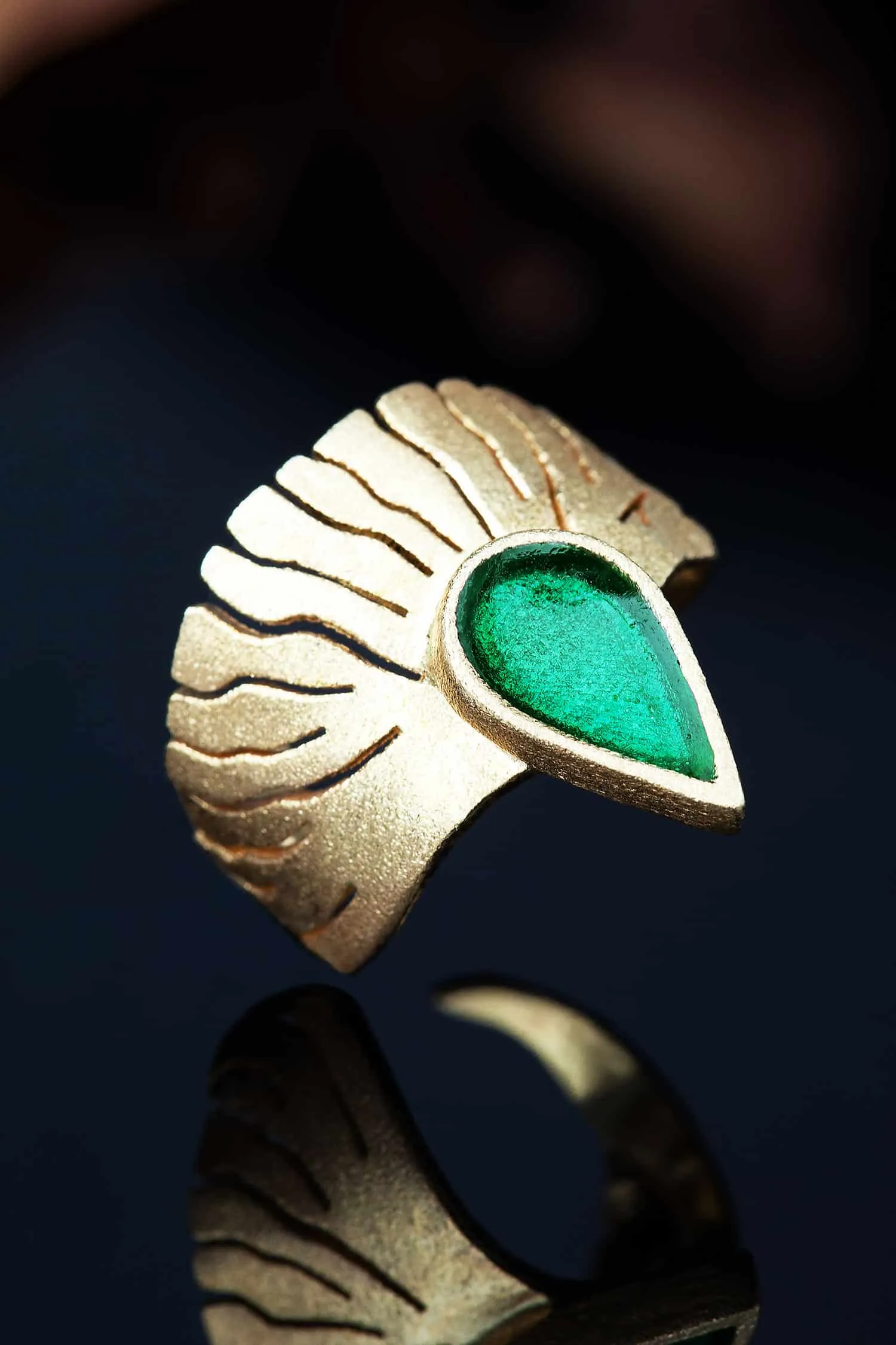 Φτερό ασημένιο επιχρυσωμένο δαχτυλίδι με πράσινο σμάλτο