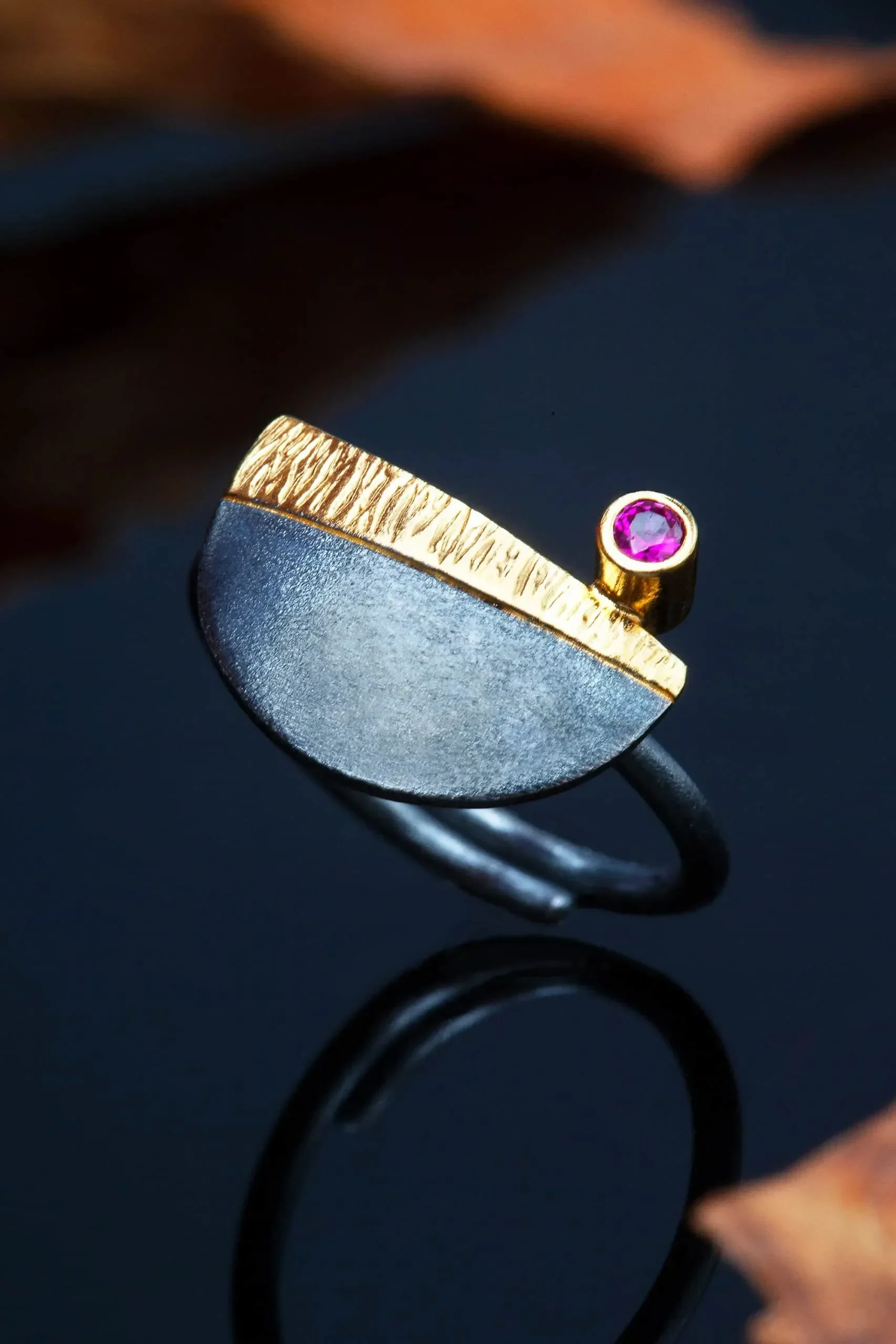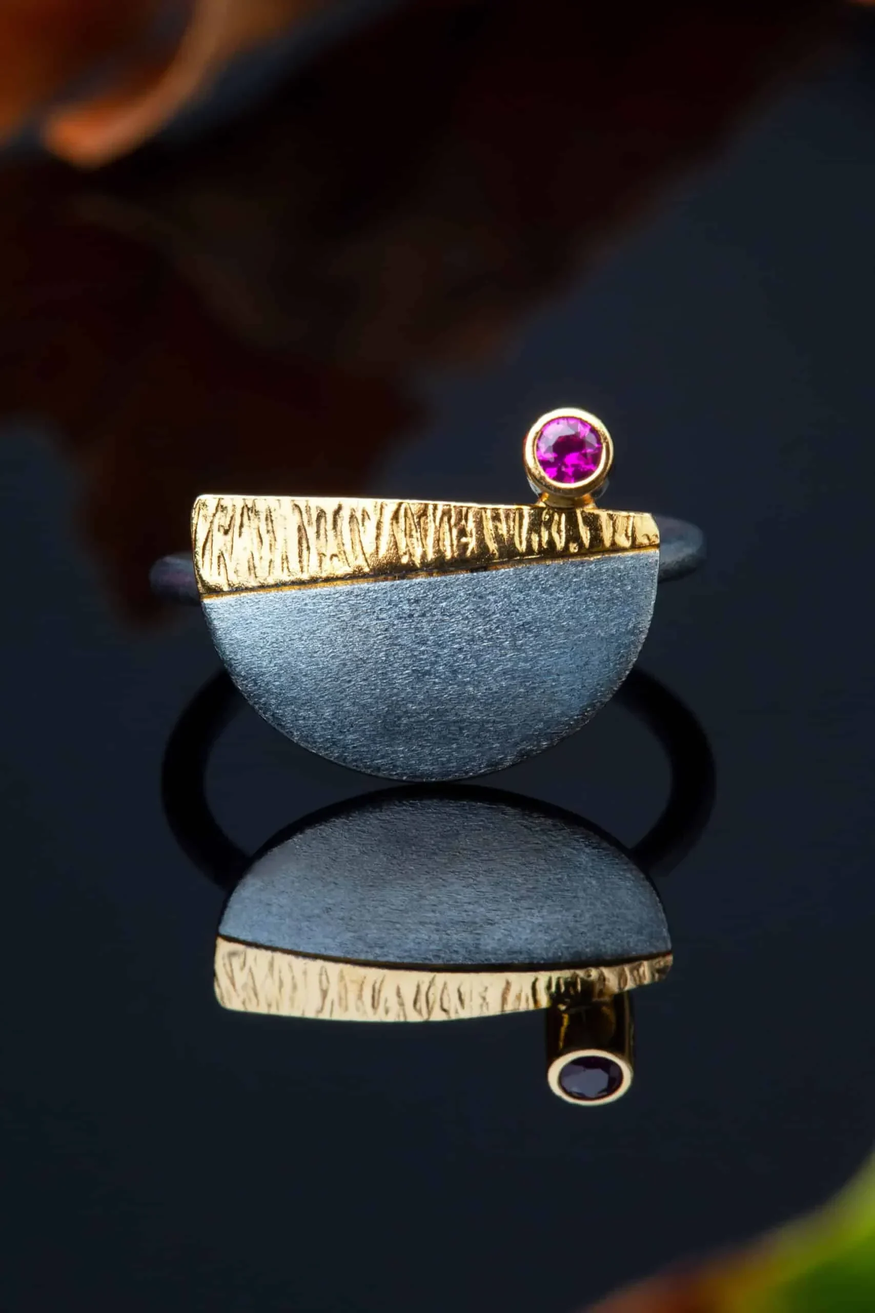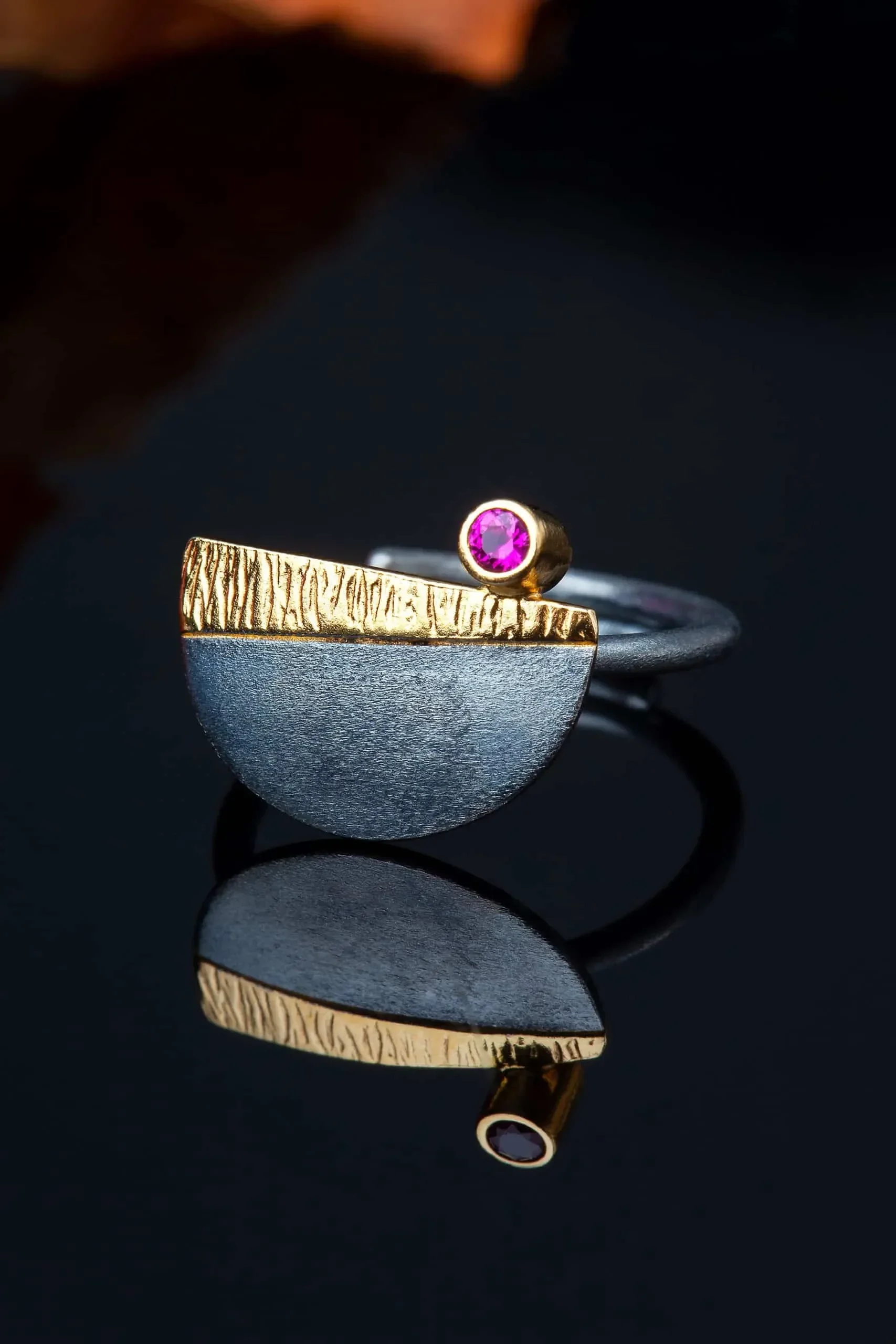 Ασημένιο δαχτυλίδι με μαύρη επιπλατίνωση, επίχρυση λεπτομέρεια και ζιργκόν