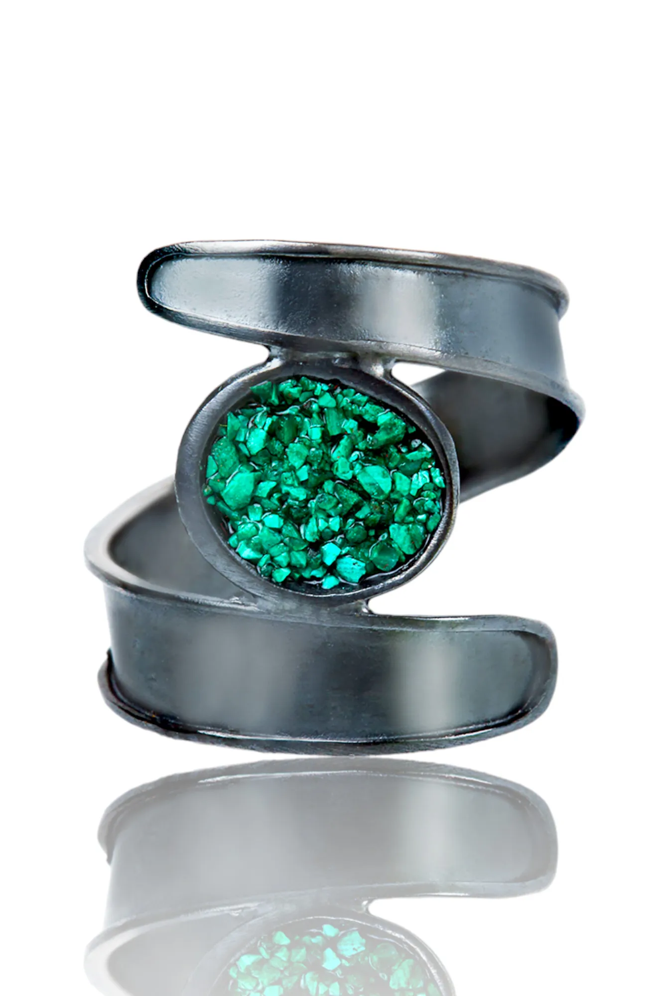 Ένα επιβλητικό και ιδιαίτερο χειροποίητο δαχτυλίδι που αιχμαλωτίζει το βλέμμα. Η σταθερή, γεωμετρική του φόρμα από οξειδωμένο ασήμι 925 σε βαθύ μαύρο χρώμα, αγκαλιάζει μοναδικά το δάχτυλο. Στο κέντρο του, ένας κύκλος γεμάτος από θρυμματισμένο μαλαχίτη δημιουργεί μια εκθαμβωτική πράσινη υφή που θυμίζει τη φύση σε ακατέργαστη μορφή. Ένα σύγχρονο statement κόσμημα για όσους αγαπούν τον δυναμικό σχεδιασμό και τις έντονες χρωματικές αντιθέσεις.