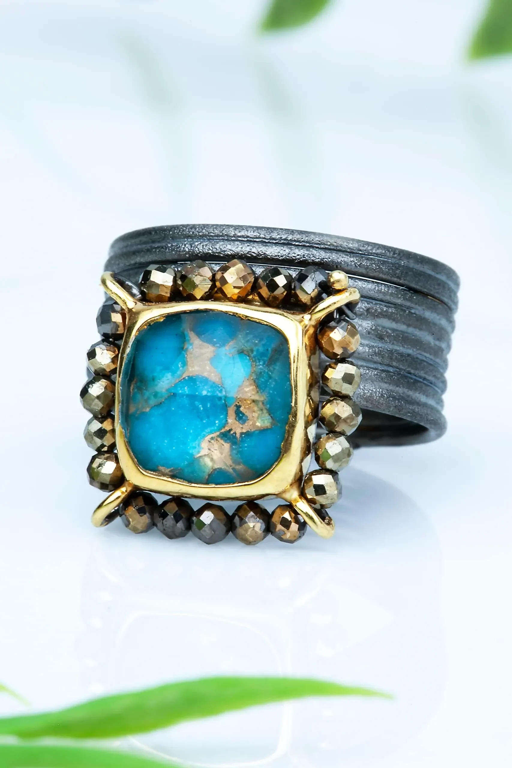 Ασημένιο δαχτυλίδι με copper τουρκουάζ και χαλαζία, μαύρη επιπλατίνωση και επίχρυση λεπτομέρεια