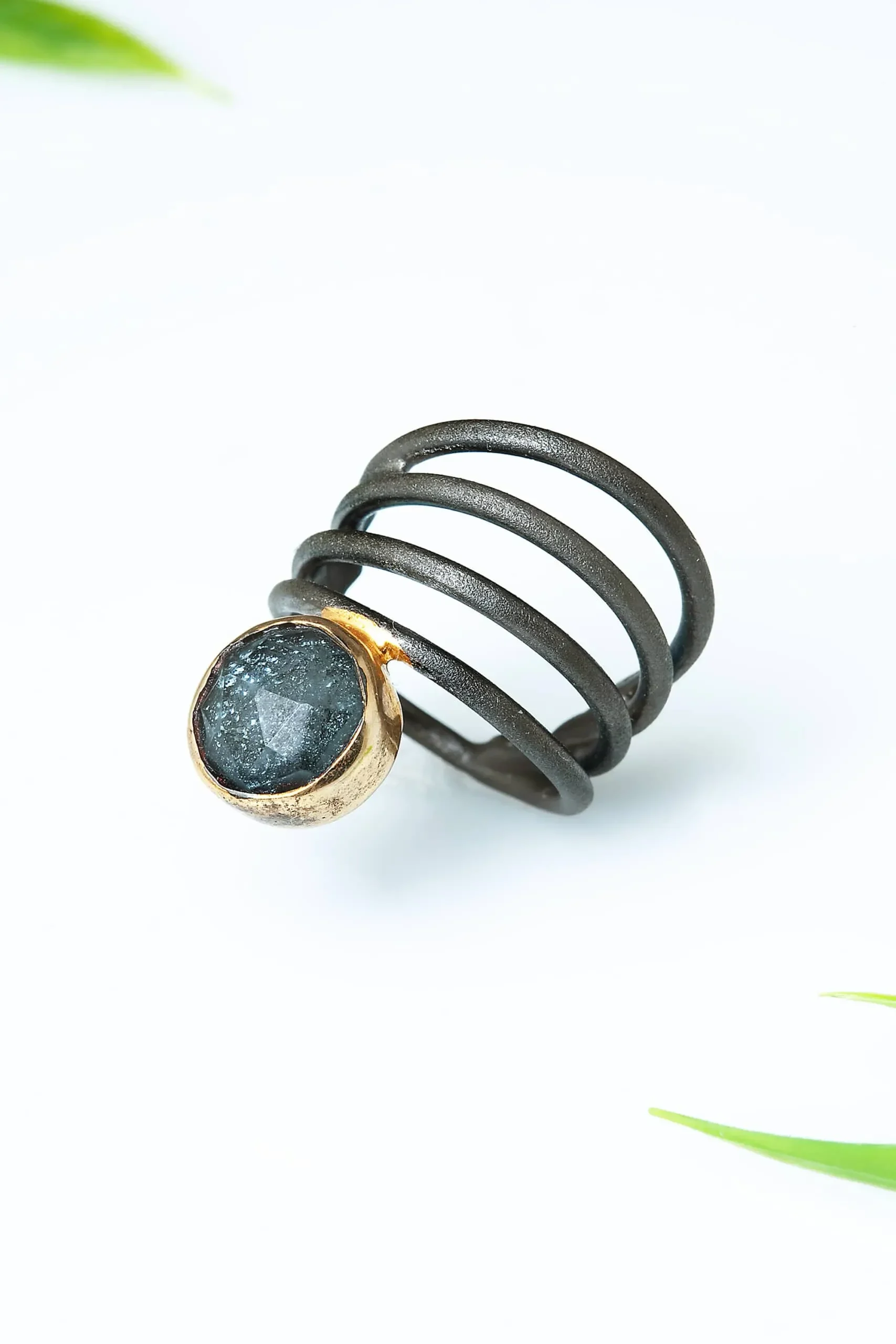 Ασημένιο δαχτυλίδι με μαύρη επιπλατίνωση και επίχρυση λεπτομέρεια δεμένο με αιματίτη και χαλαζία