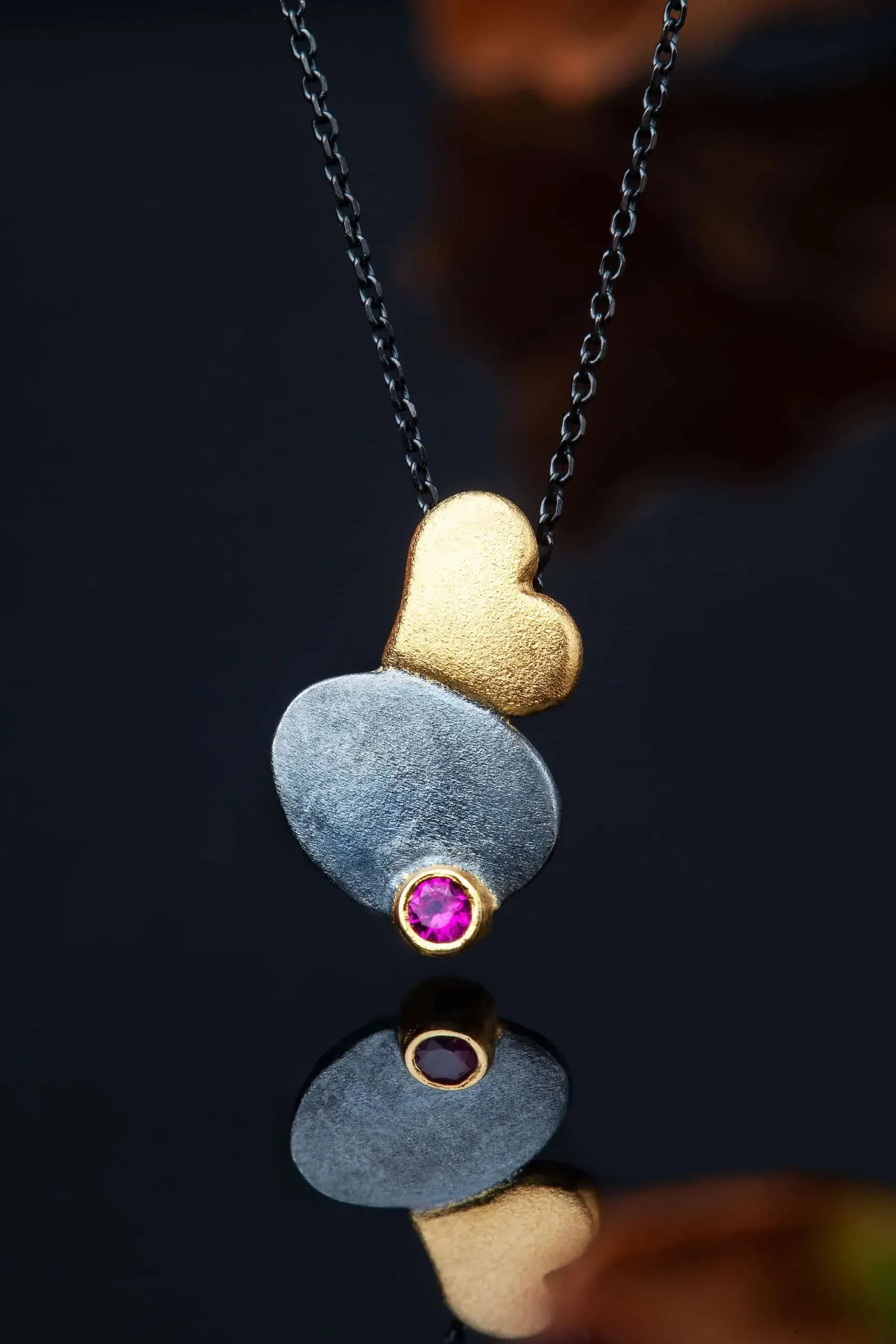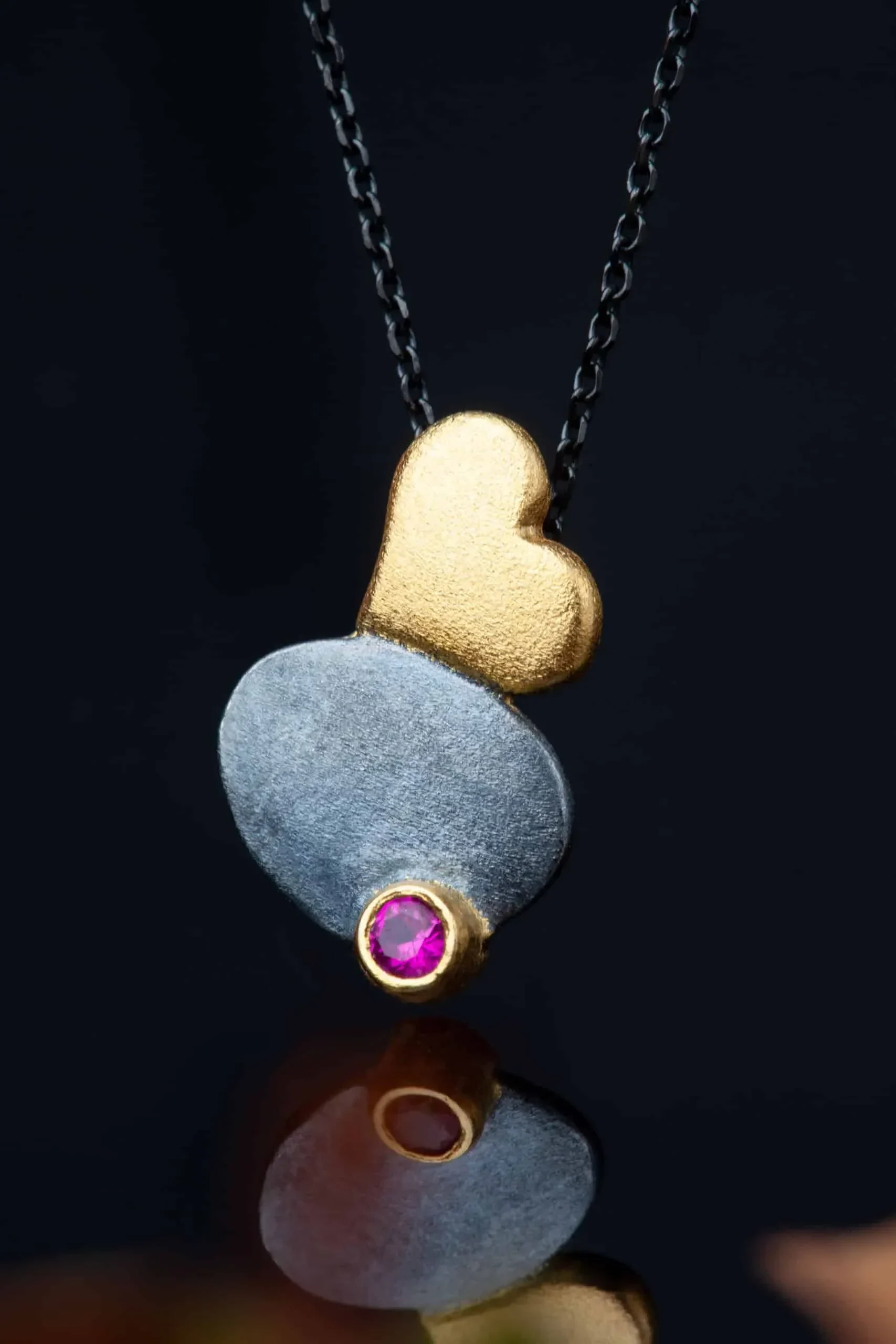 Ασημένιο κολιέ καρδιά, με μαύρη επιπλατίνωση, επίχρυσες λεπτομέρειες και ζιργκόν