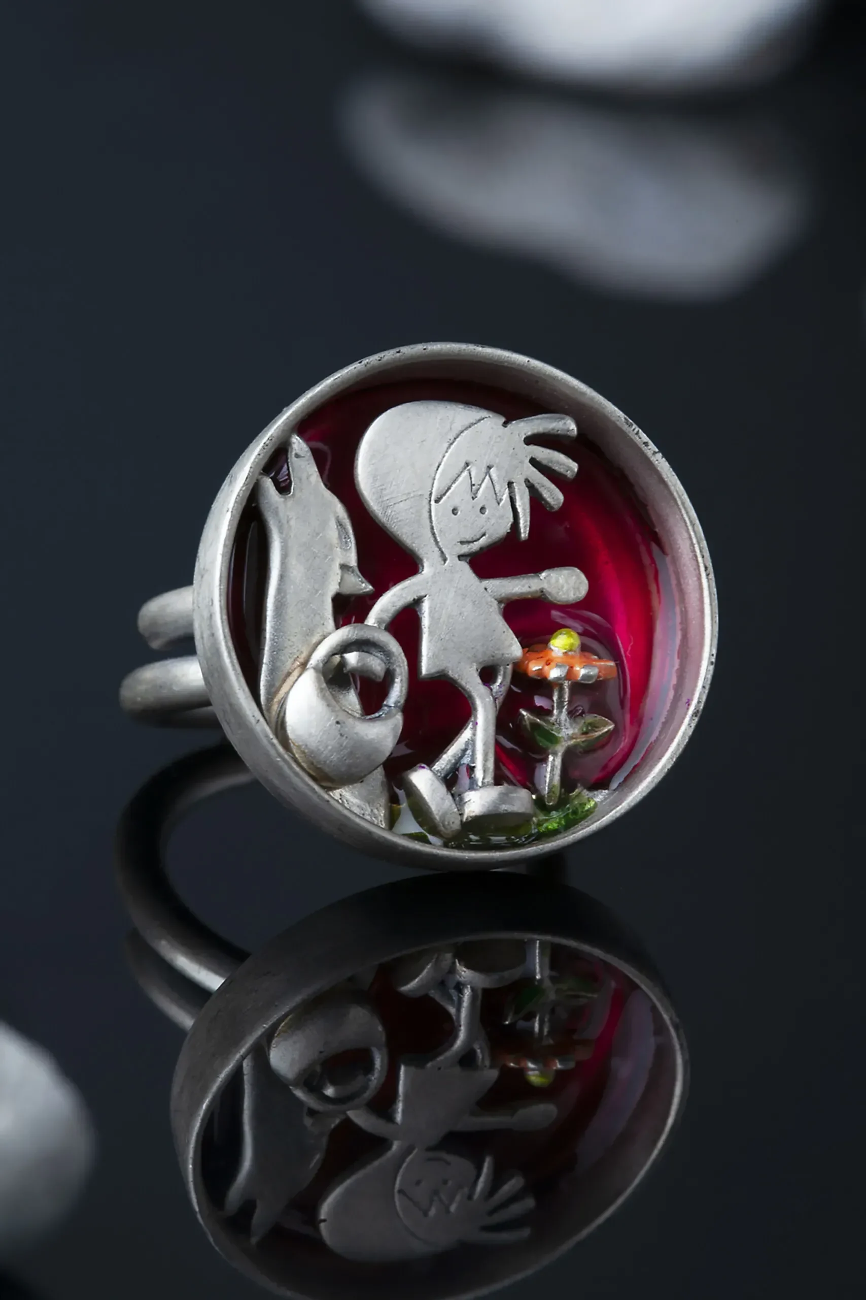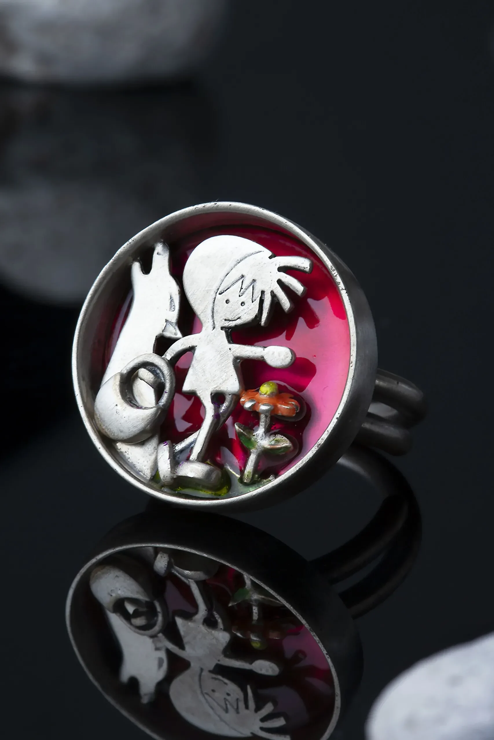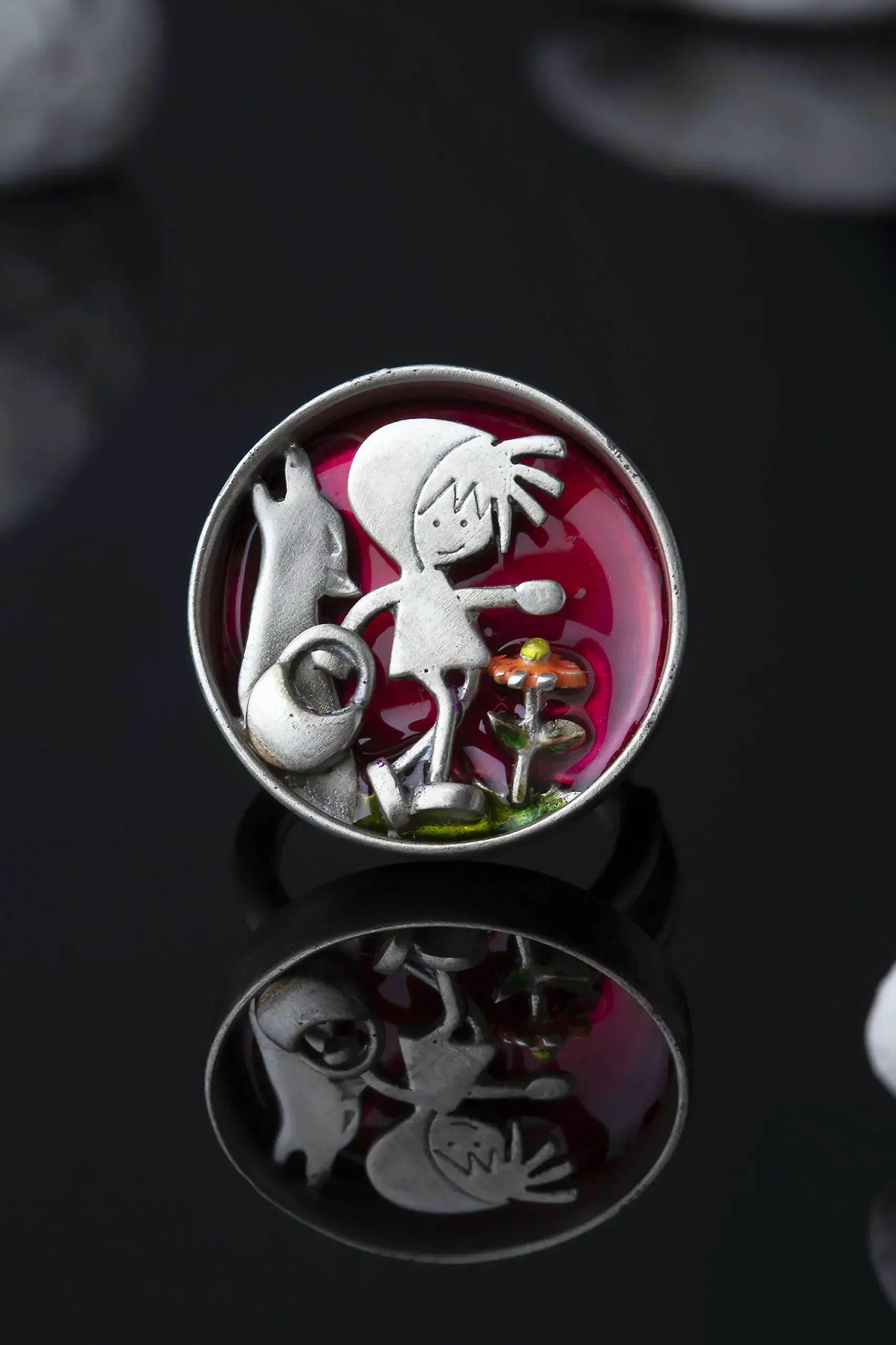 Ασημένιο οξειδωμένο δαχτυλίδι με σμάλτο, την Κοκκινοσκουφίτσα και τον κακό λύκο