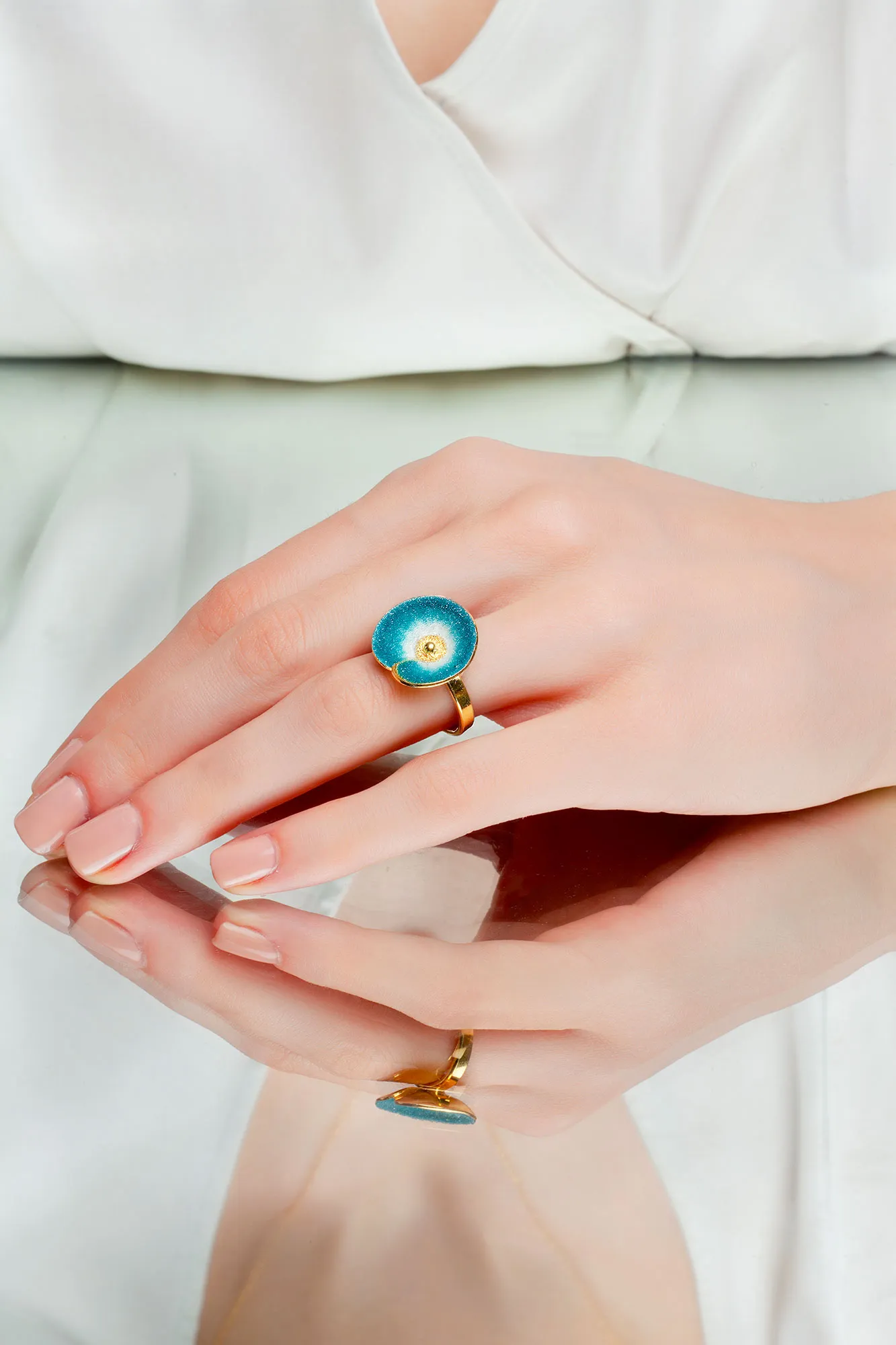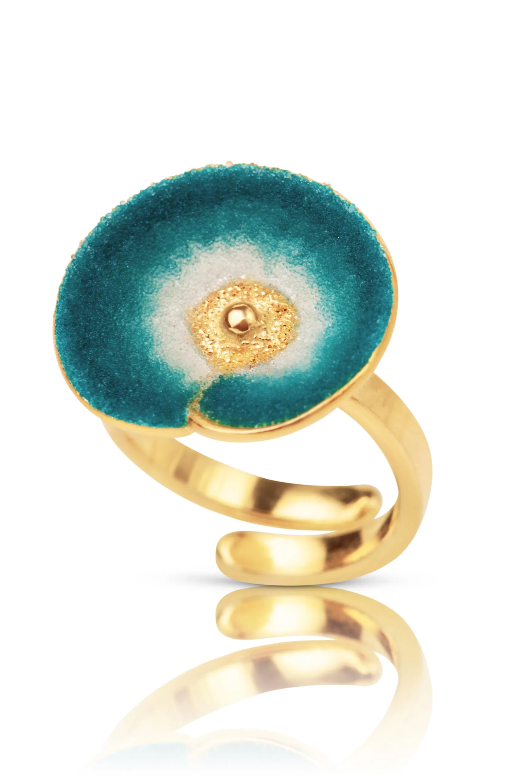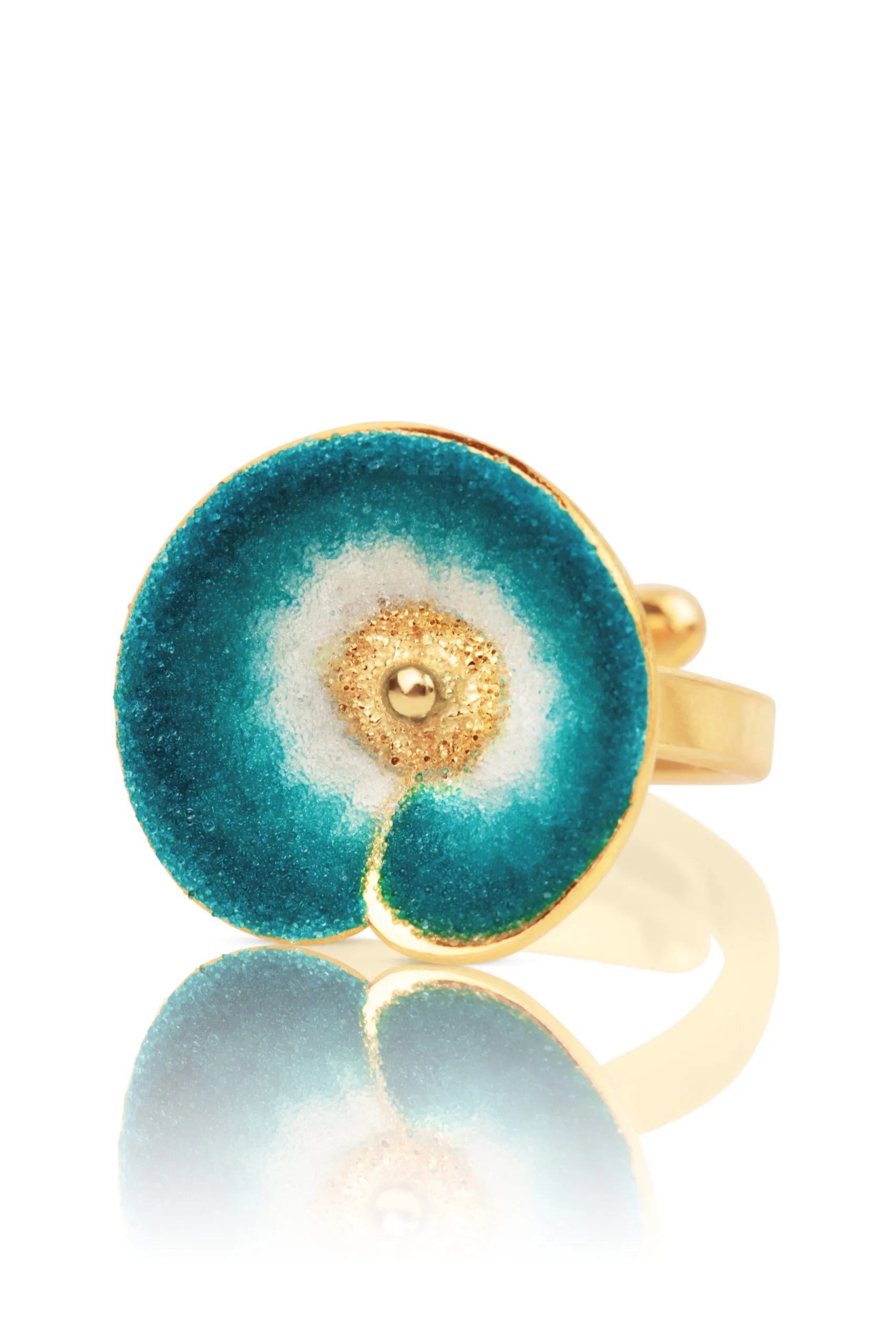 Introducing our stunning Flower handmade gold-plated adjustable silver ring, adorned with sparkling blue and white nanocrystals. This exquisite piece is handcrafted with love and attention to detail, making it truly one-of-a-kind. The adjustable design ensures a perfect fit for any finger size, while the gold-plating adds a touch of luxury. The combination of blue and white nanocrystals creates a mesmerizing floral pattern, making this ring a true statement piece. Elevate any outfit with this versatile and elegant ring. Perfect for special occasions or everyday wear, this ring will add a touch of glamour to your ensemble. Don’t miss out on this unique and beautiful addition to your jewellery collection. Order now and get ready to shine!