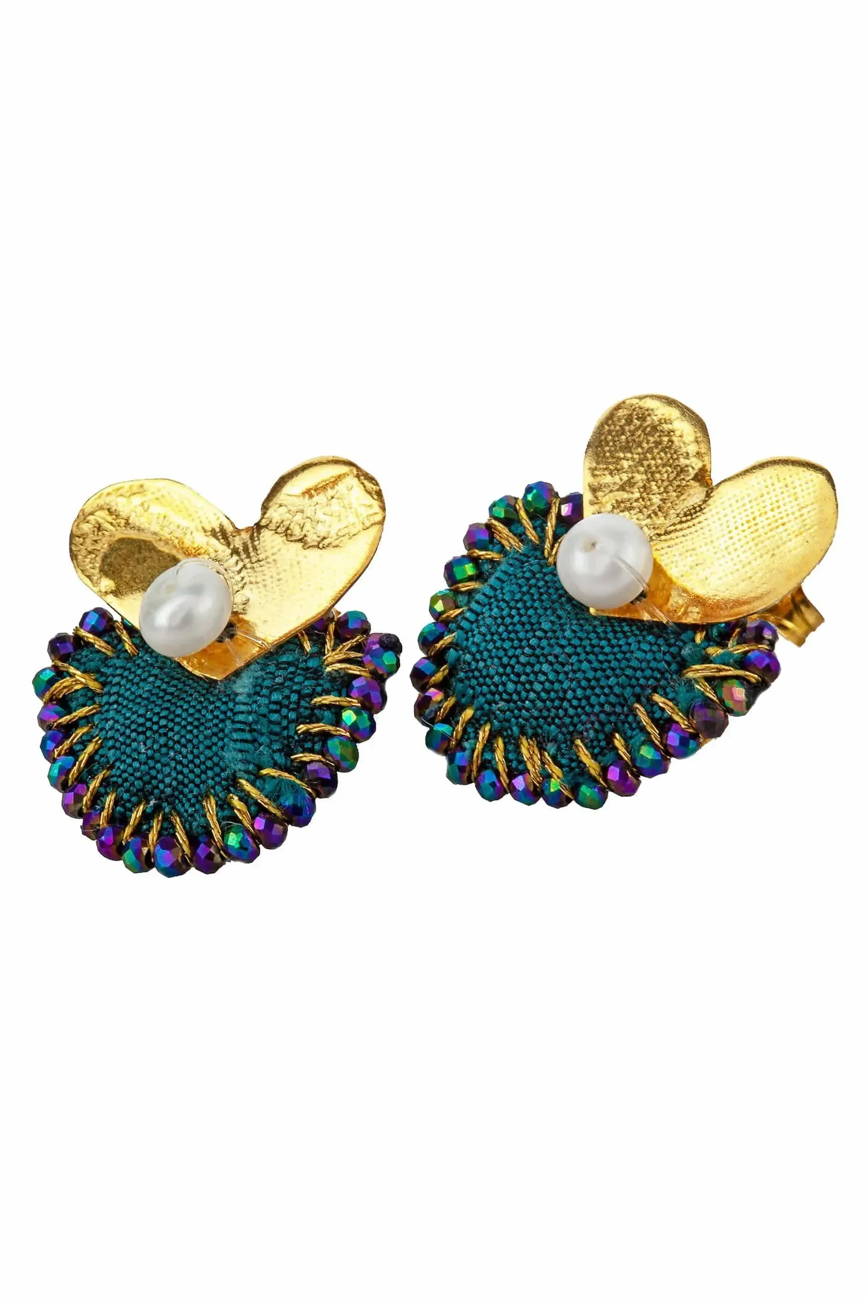 Καρδιές ασημένια επίχρυσα σκουλαρίκια με πράσινο ύφασμα, σπινέλιο και μαργαριτάρια