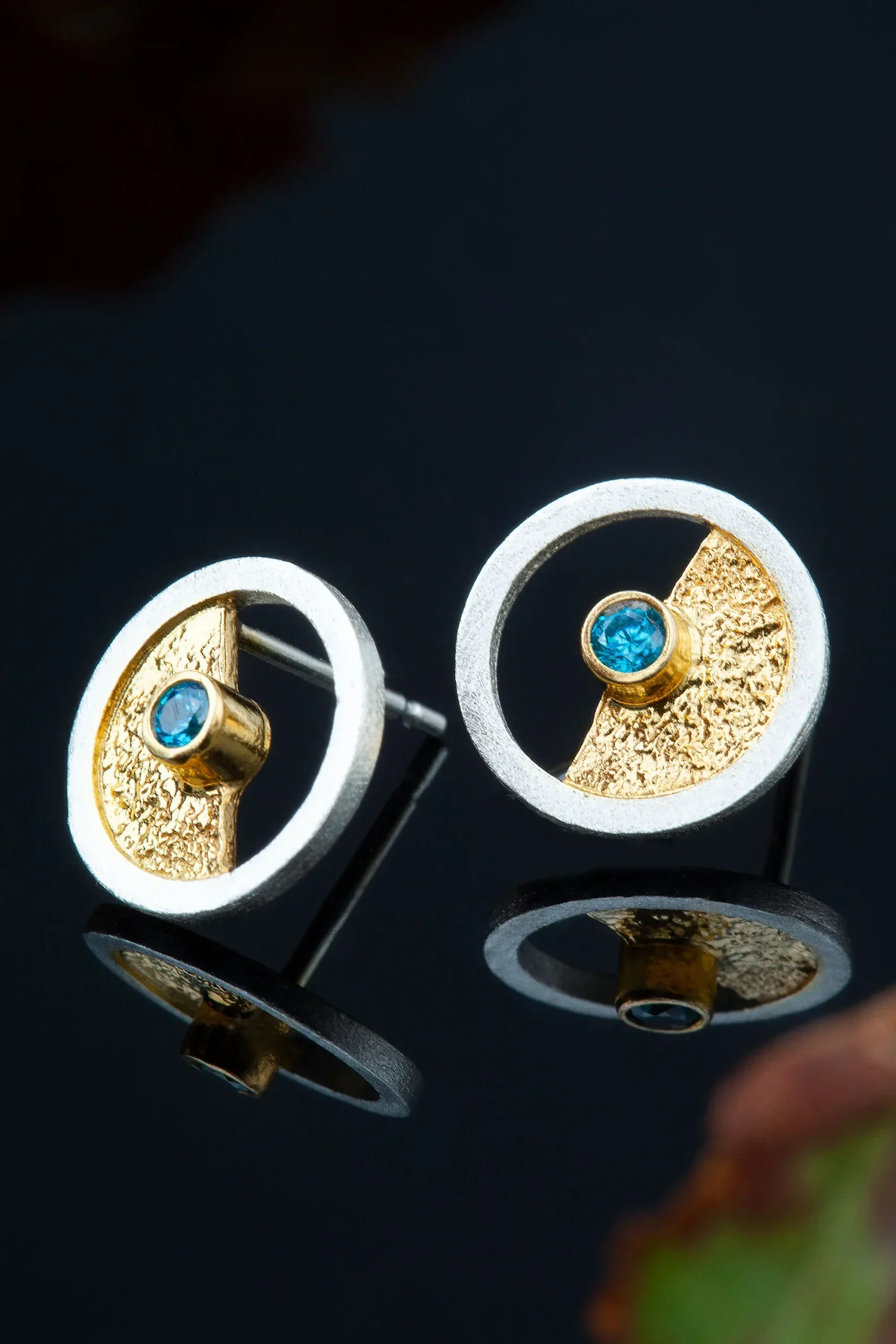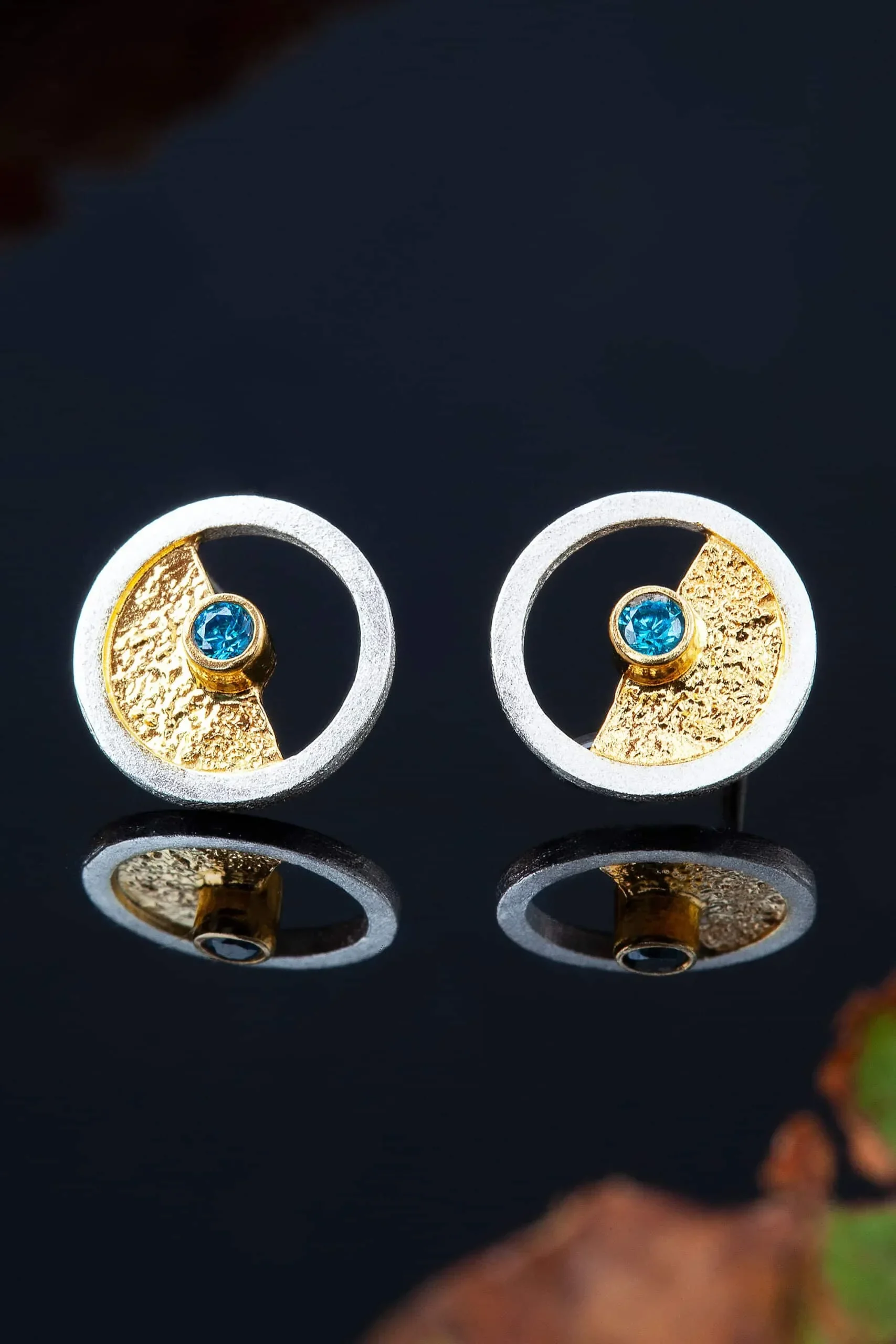 Κυκλικά ασημένια σκουλαρίκια με επιπλατίνωση και επίχρυσες λεπτομέρειες, συνδυασμένα με ζιργκόν