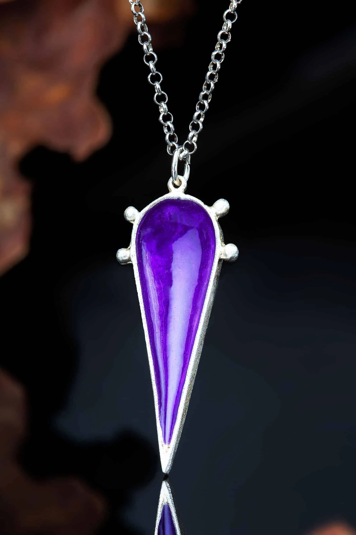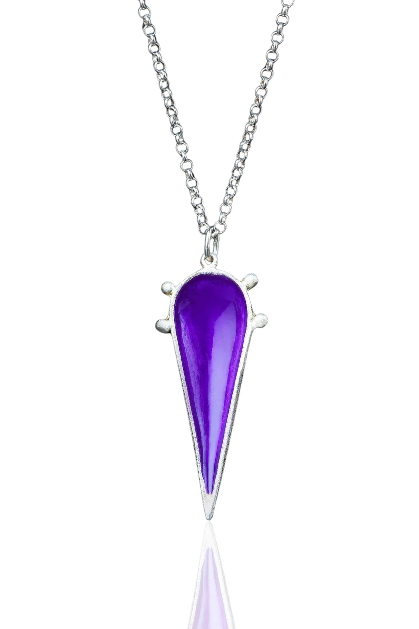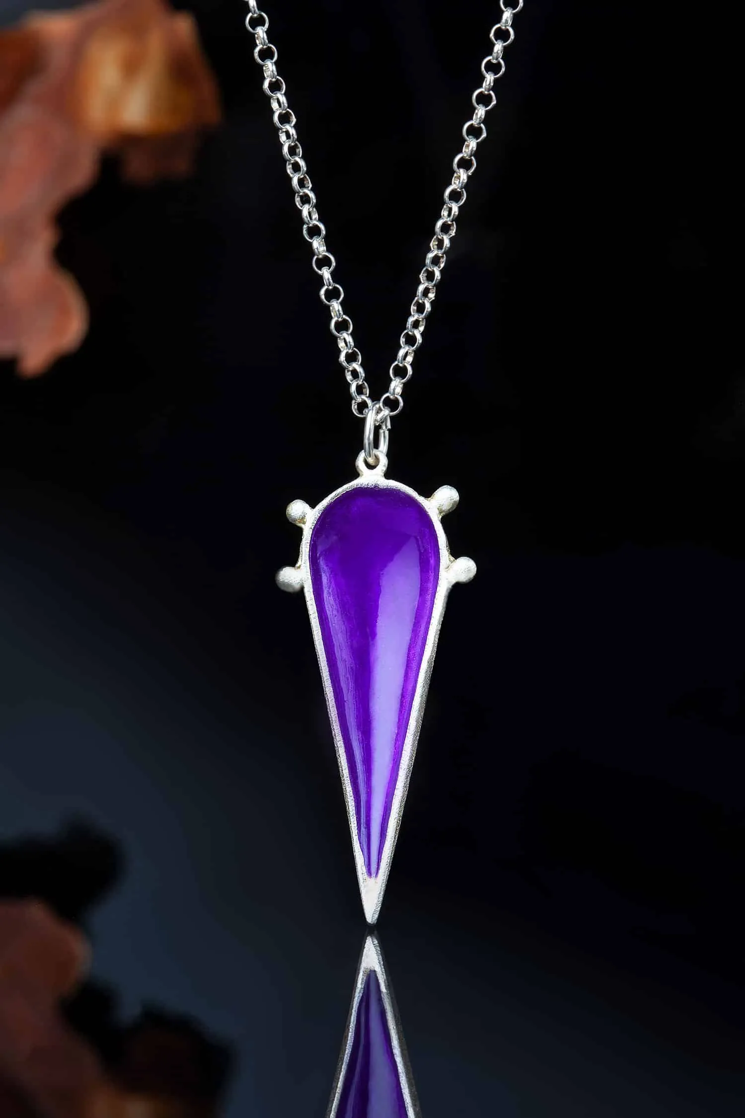 This minimalist silver long necklace is the perfect addition to any outfit. The sleek silver metal is highlighted by the bold purple enamel detailing that adds a hint of colour to your look. Whether you’re wearing a casual or formal outfit, this necklace is the perfect way to add some subtle sparkle. The long length makes it the perfect layering piece and adds a touch of sophistication to your look. With its timeless design, this necklace is sure to be a favourite for years to come.