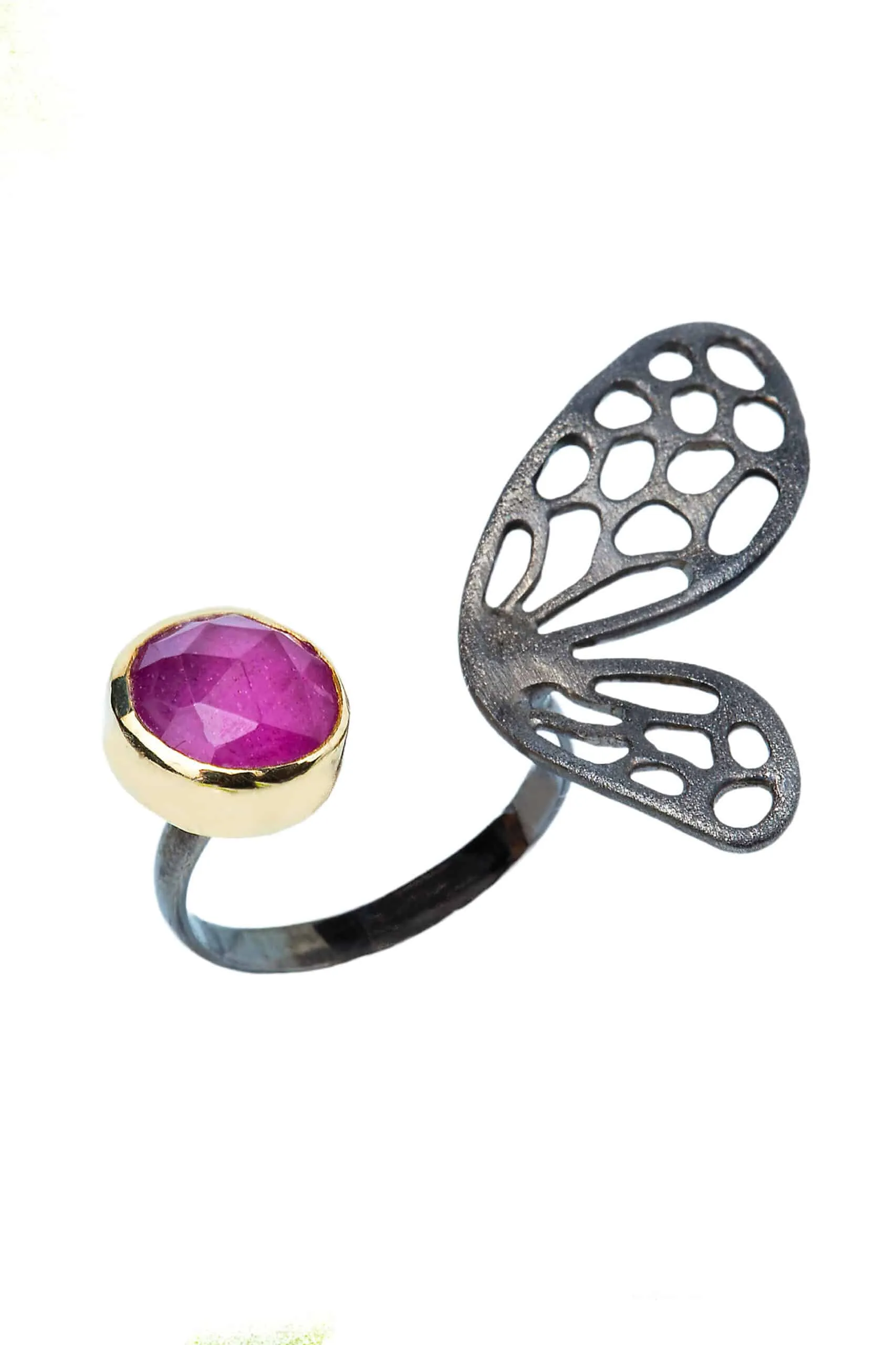 Πεταλούδα ρουμπίνι μαύρο ασημένιο δαχτυλίδι