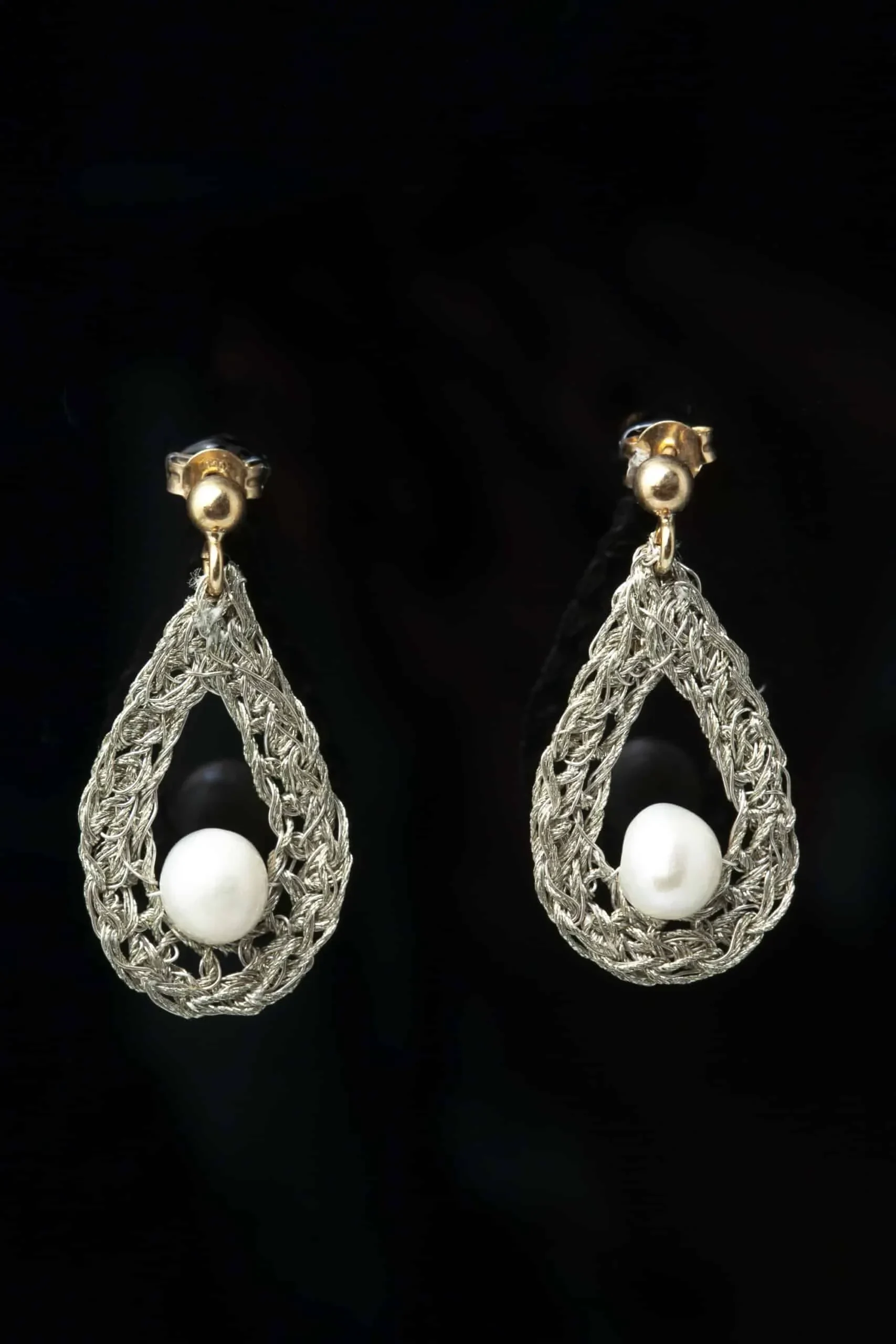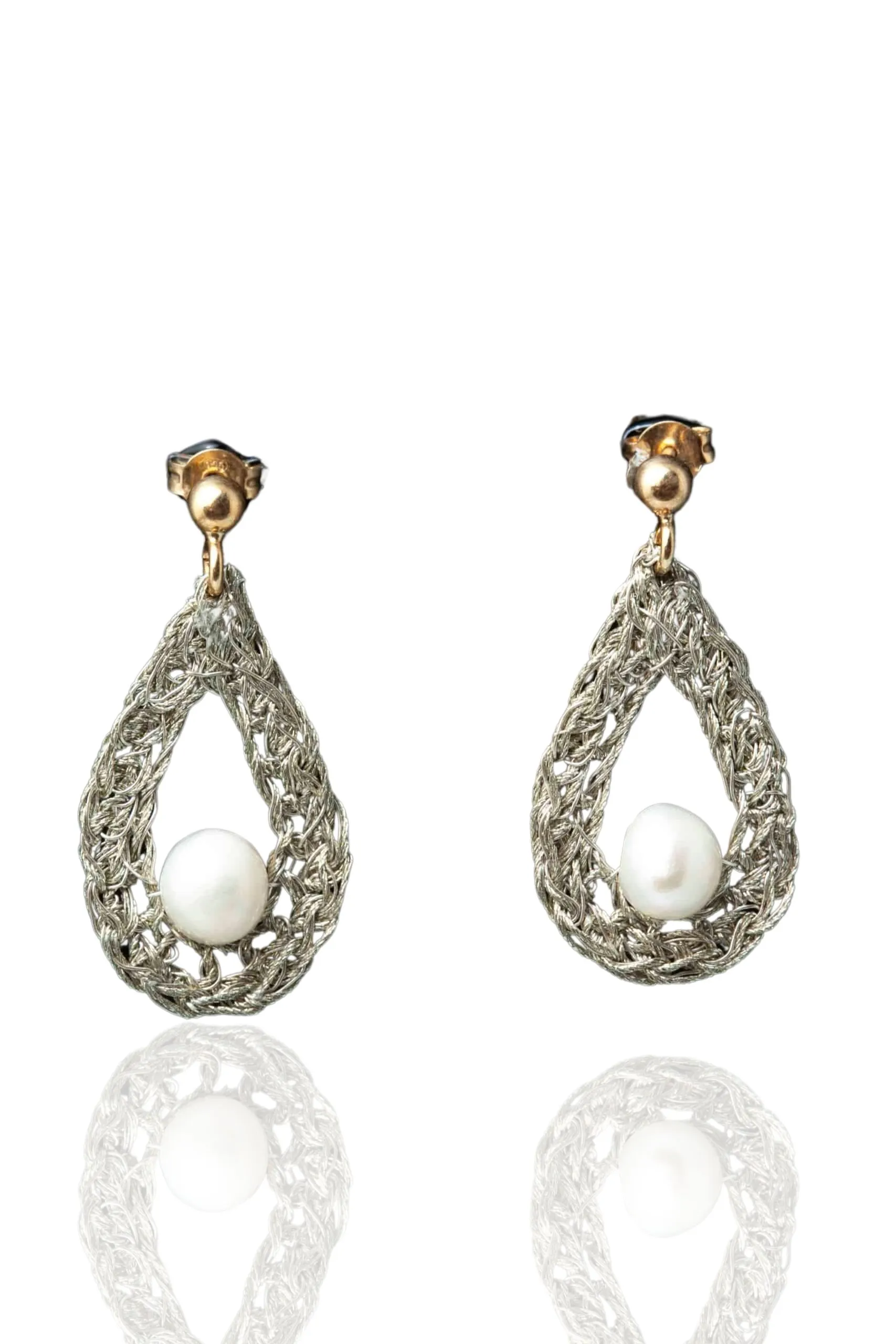 Πλεκτά ασημένια σκουλαρίκια με χρυσόνημα και μαργαριτάρια