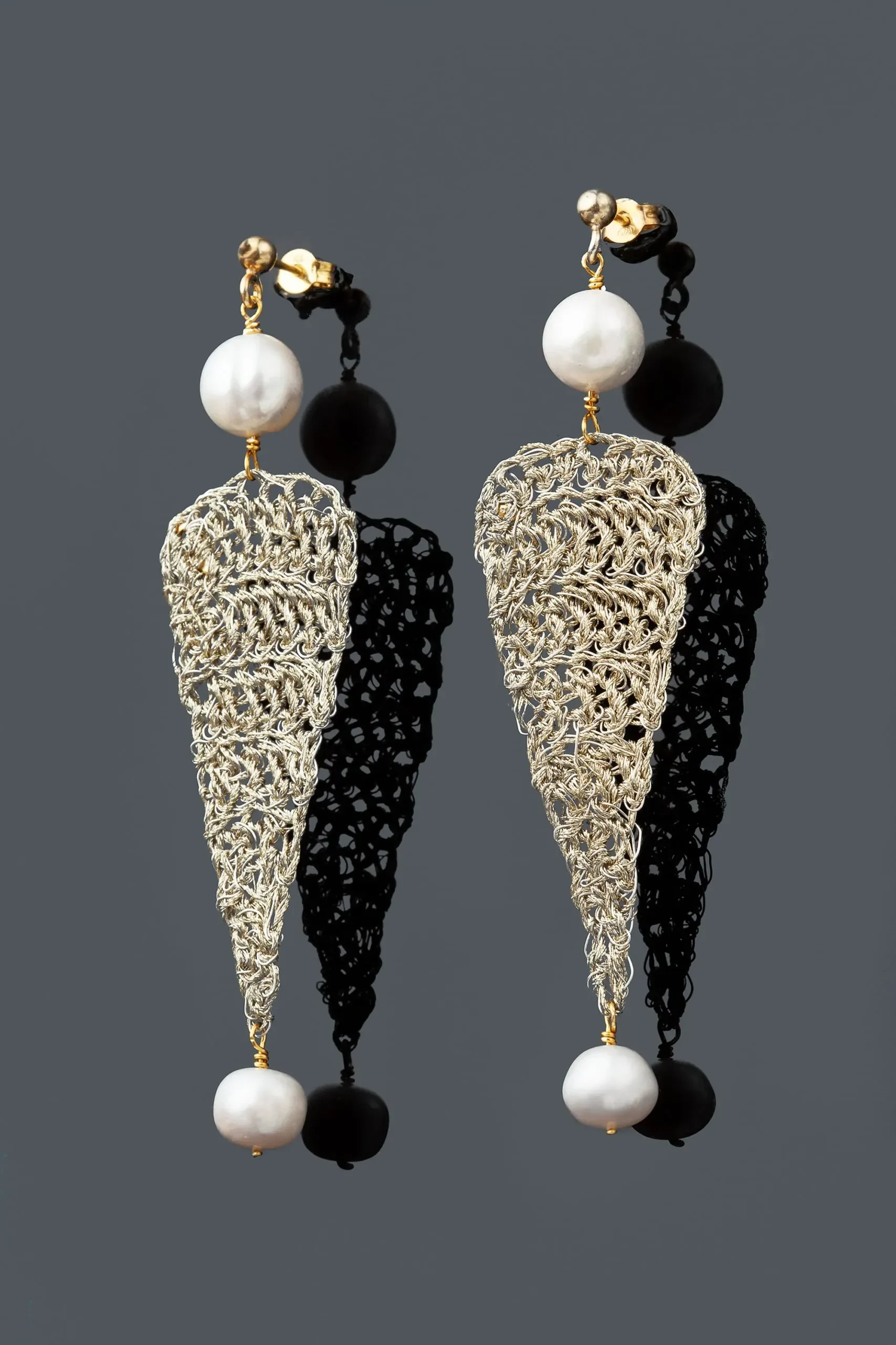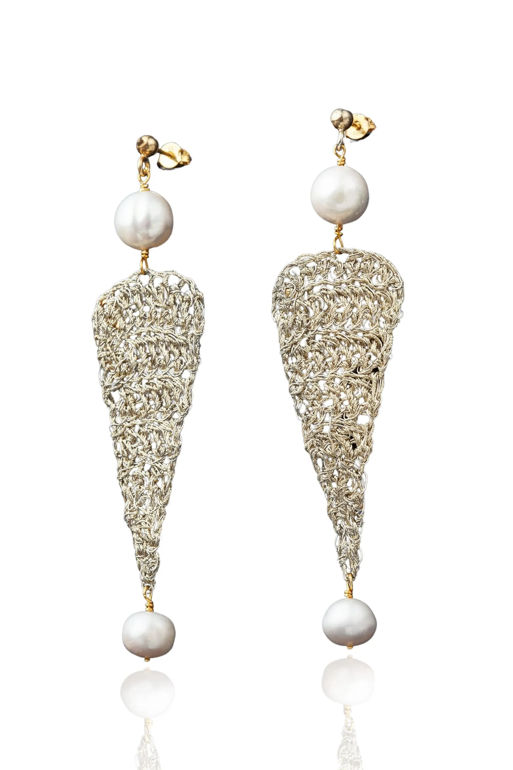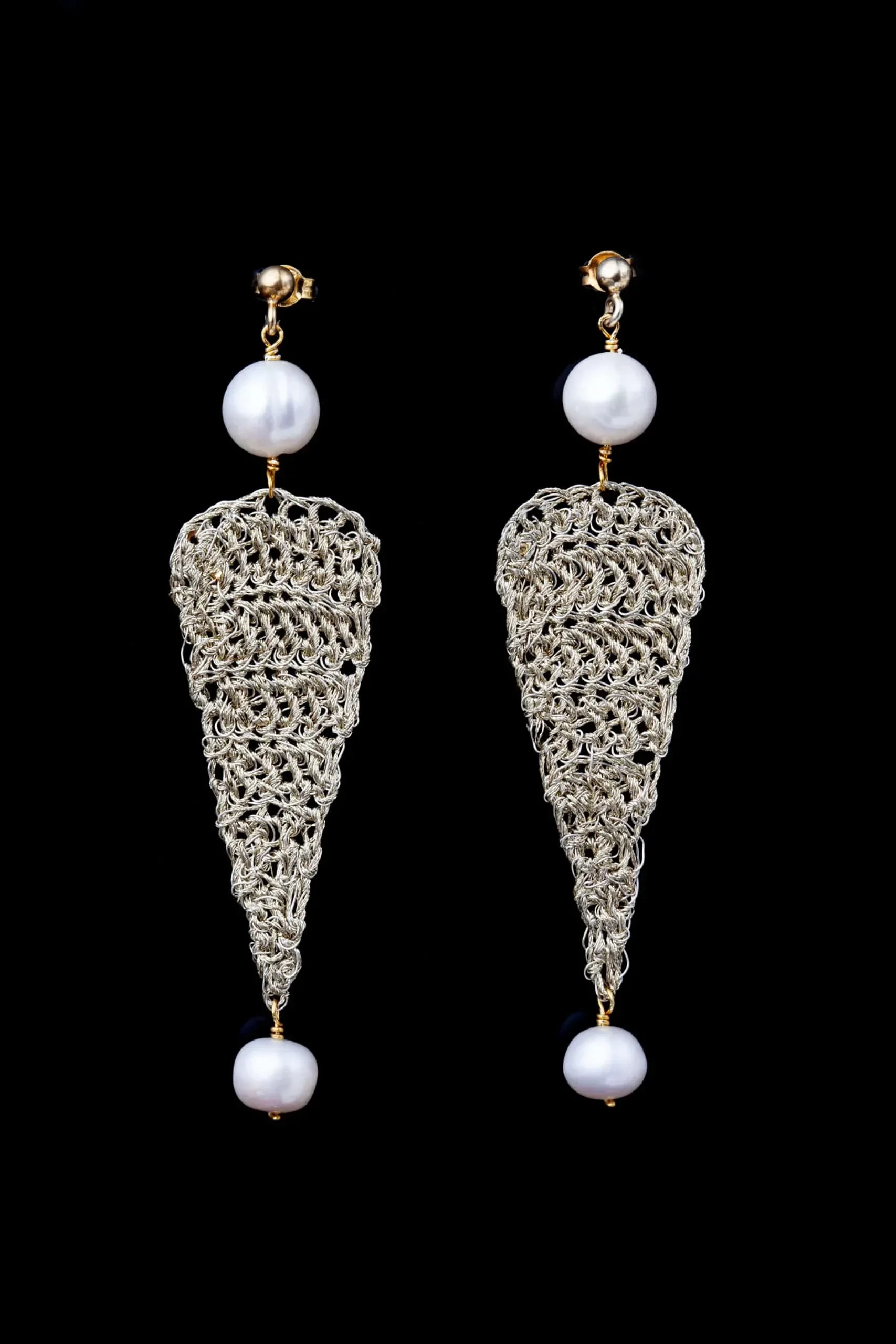 Πλεκτά ασημένια σκουλαρίκια με χρυσόνημα και μαργαριτάρια