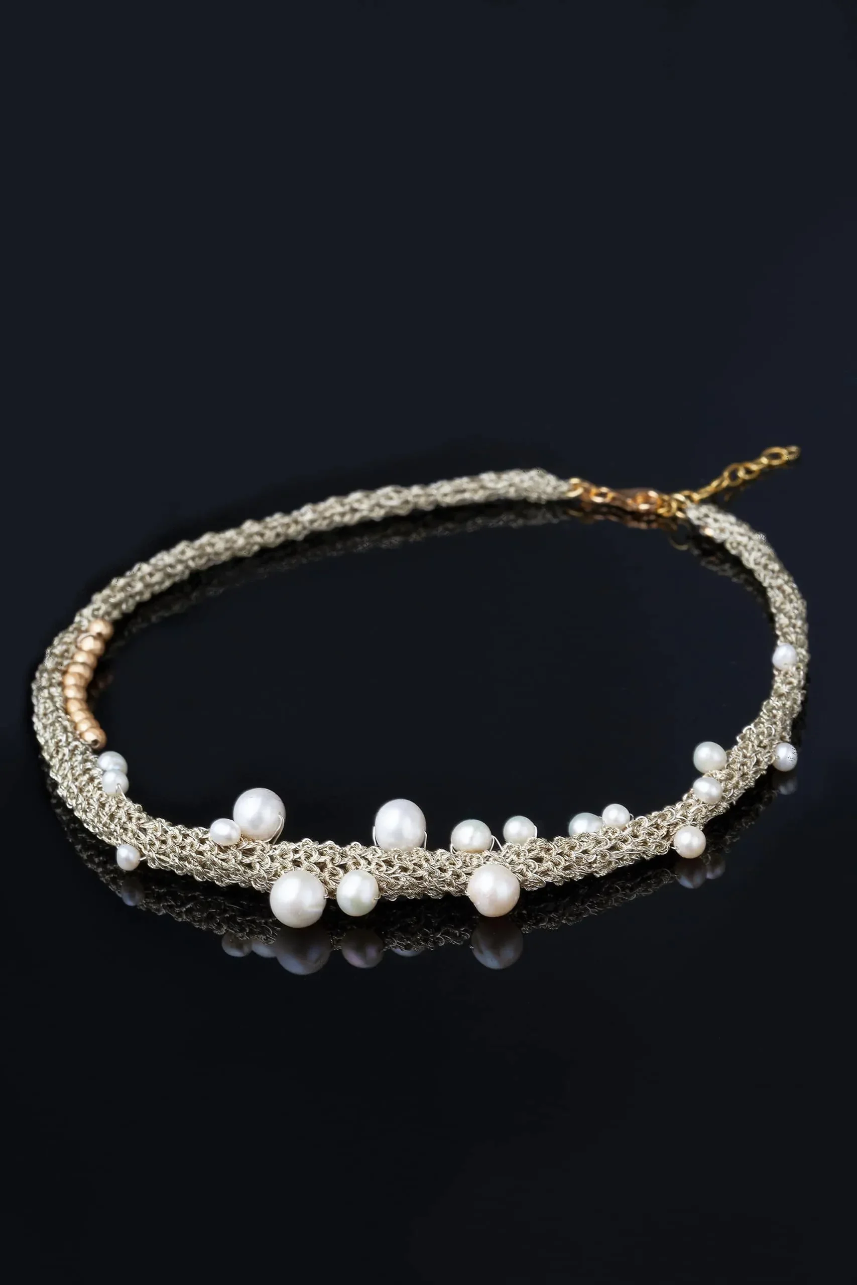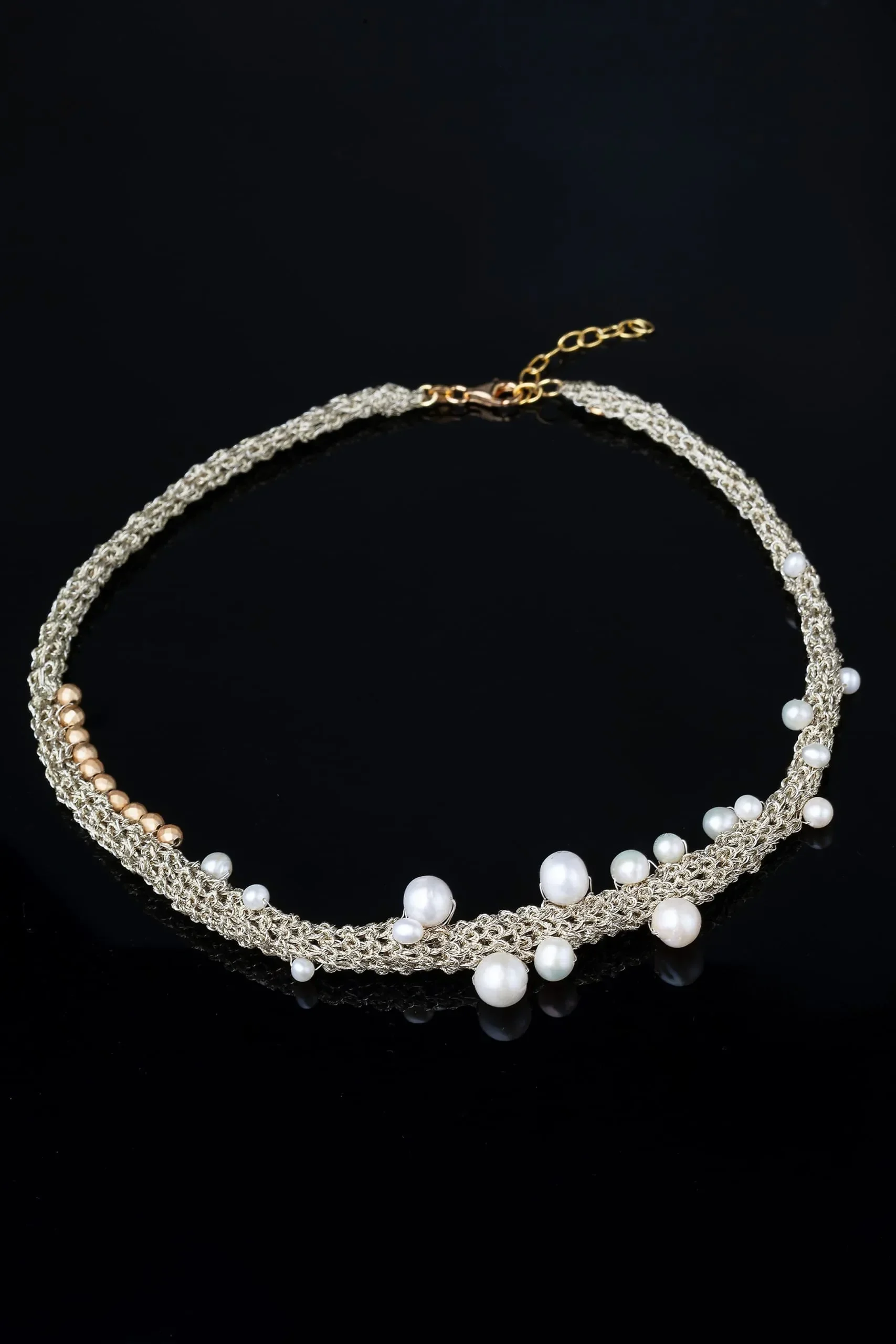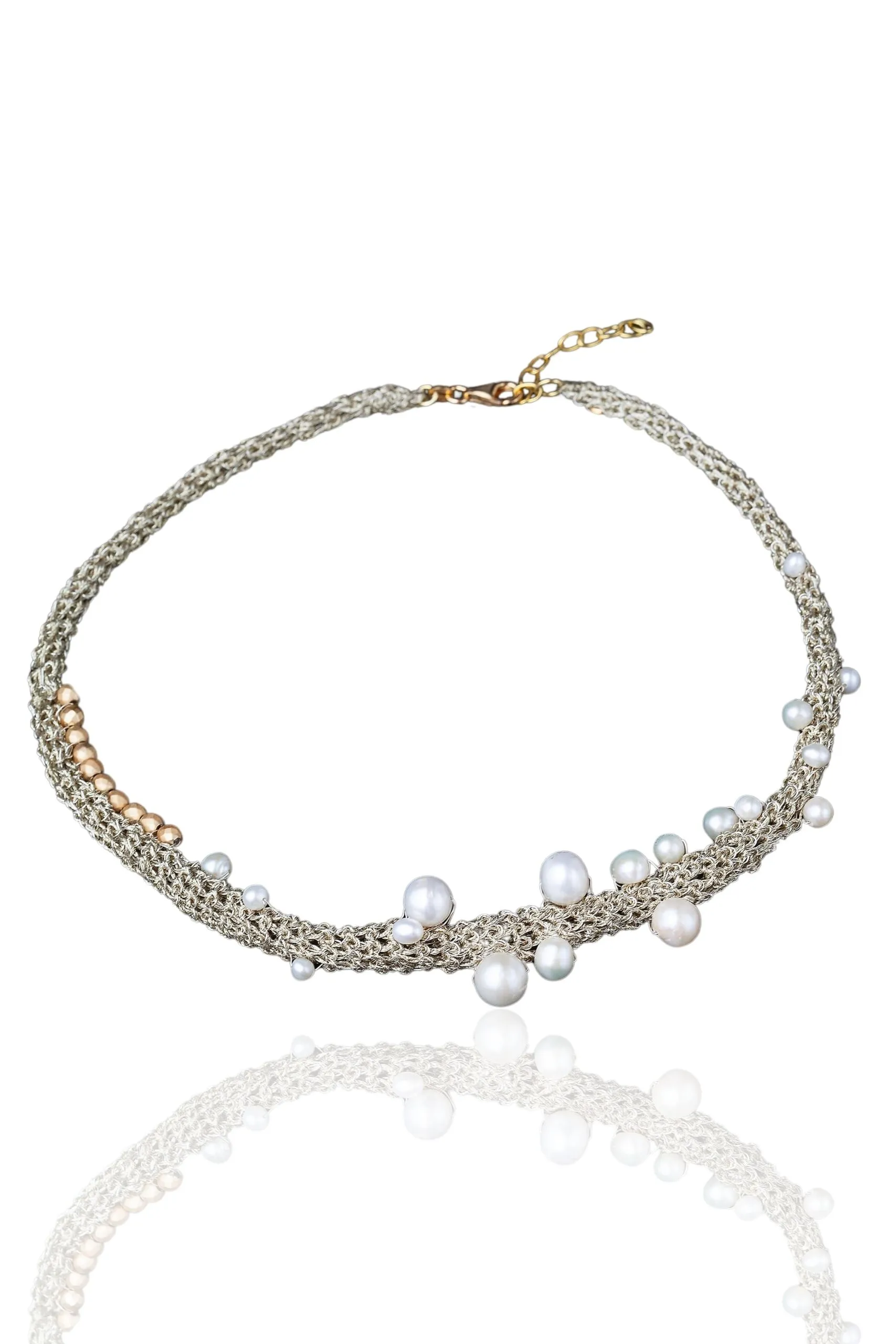Πλεκτό ασημένιο περιδέραιο με χρυσόνημα, μαργαριτάρια και σιδηροπυρίτη