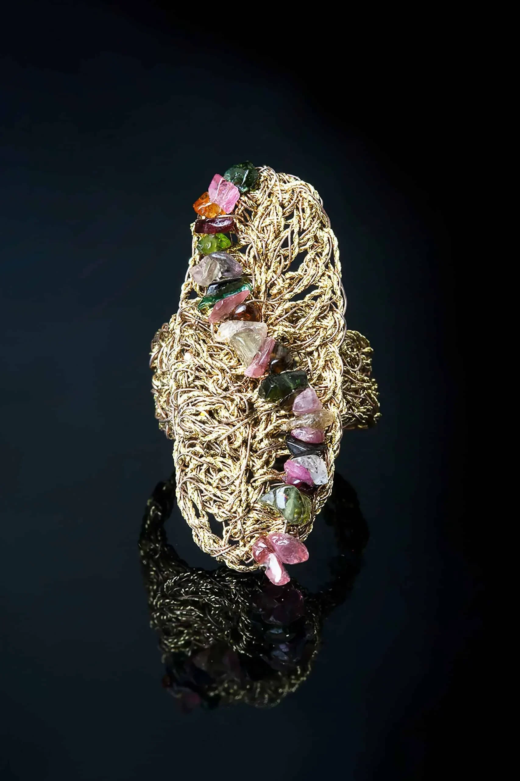 Πλεκτό ασημένιο δαχτυλίδι με χρυσόνημα και τουρμαλίνη