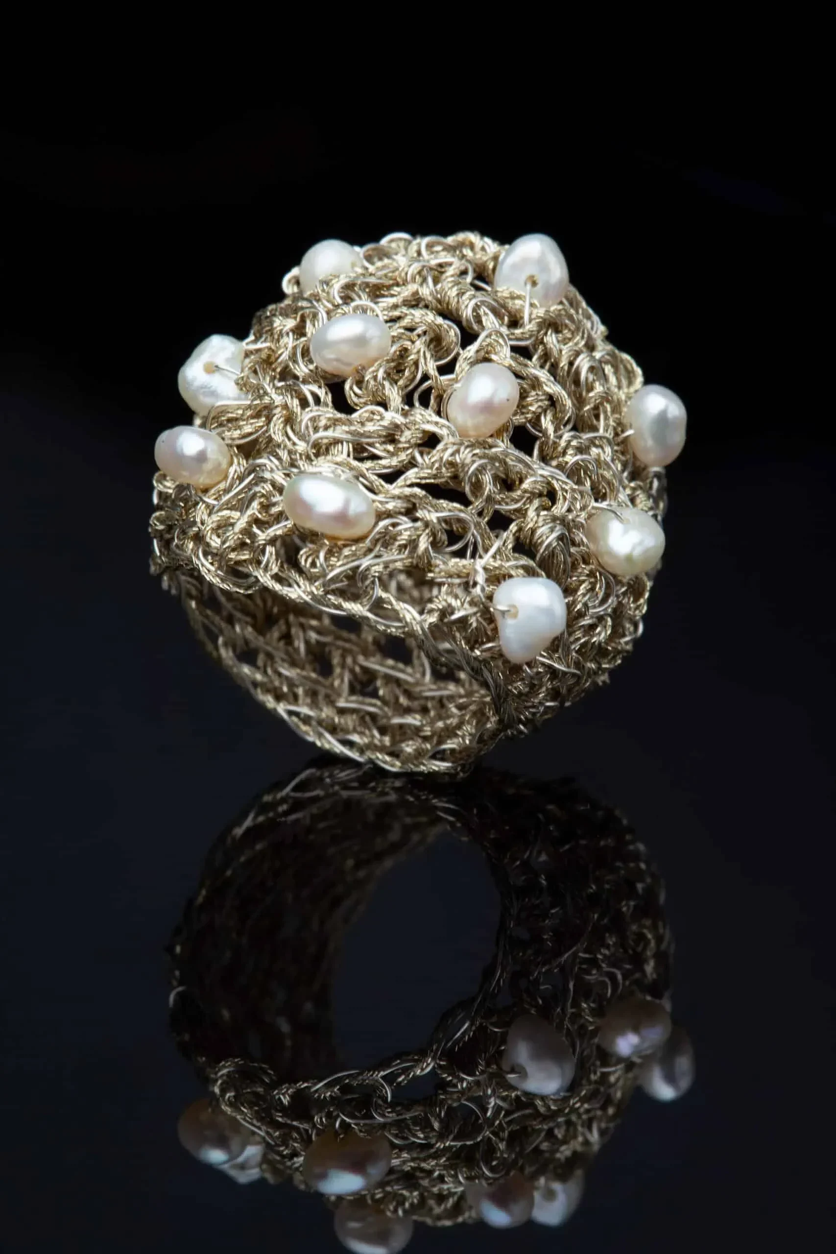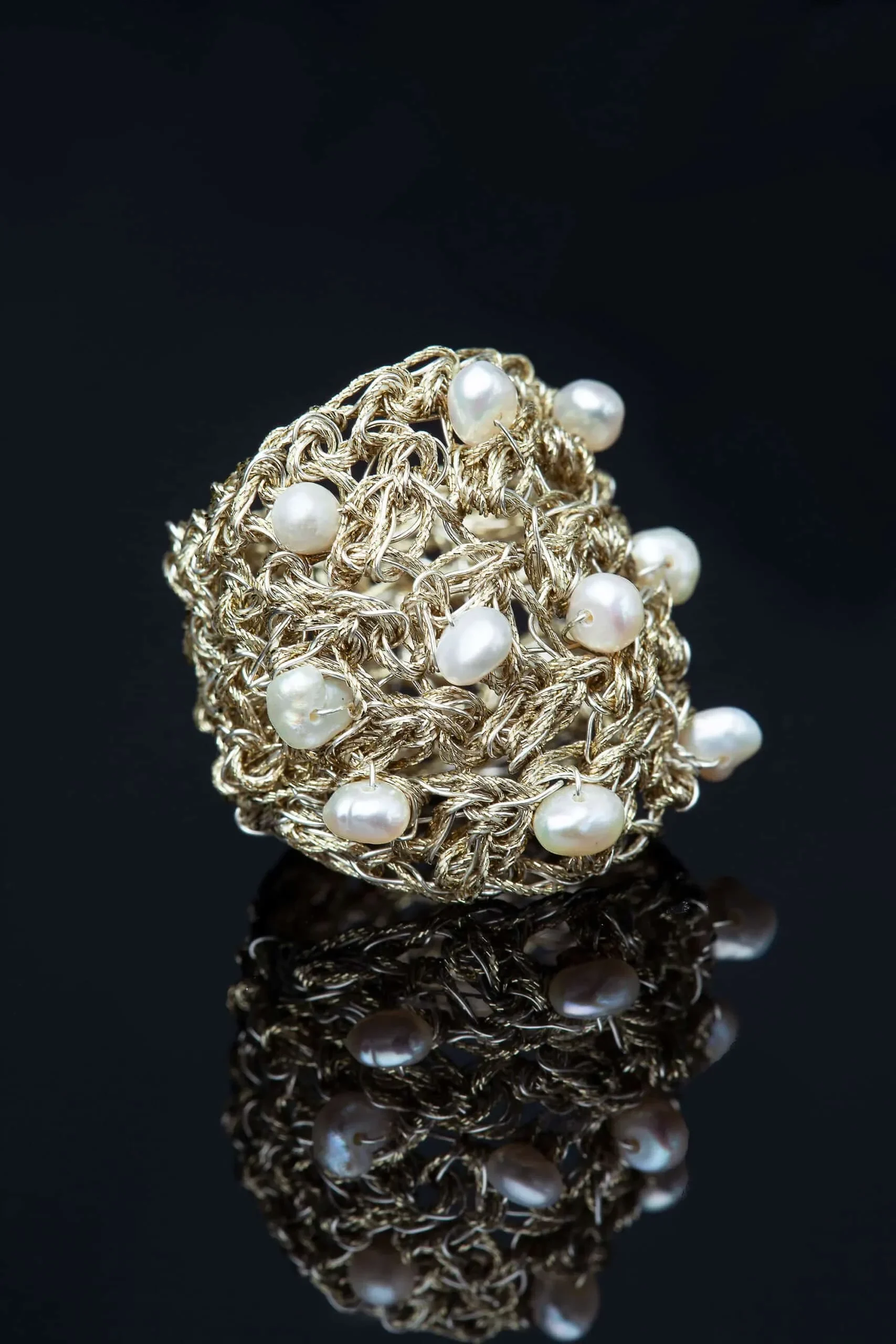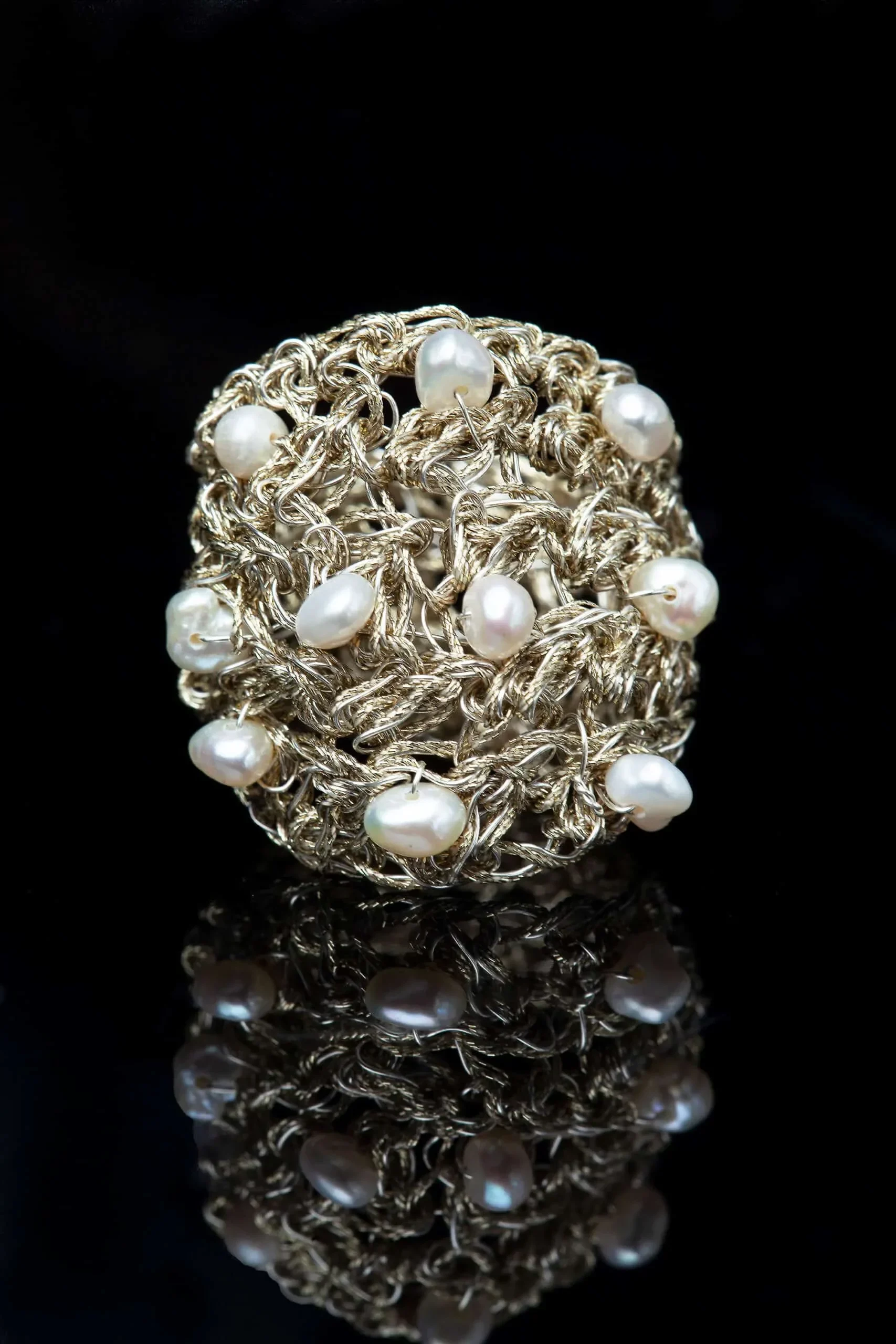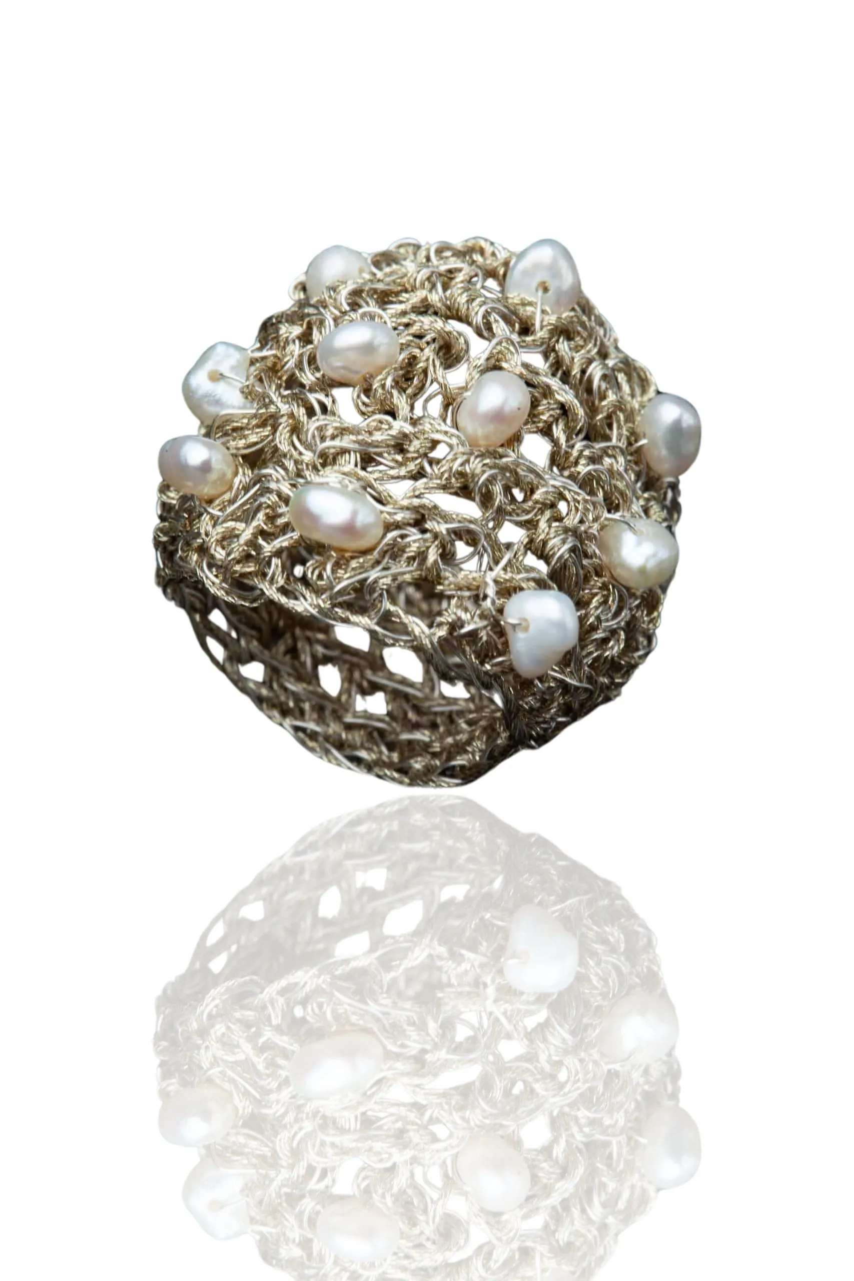 Πλεκτό ασημένιο δαχτυλίδι με χρυσόνημα και μαργαριτάρια