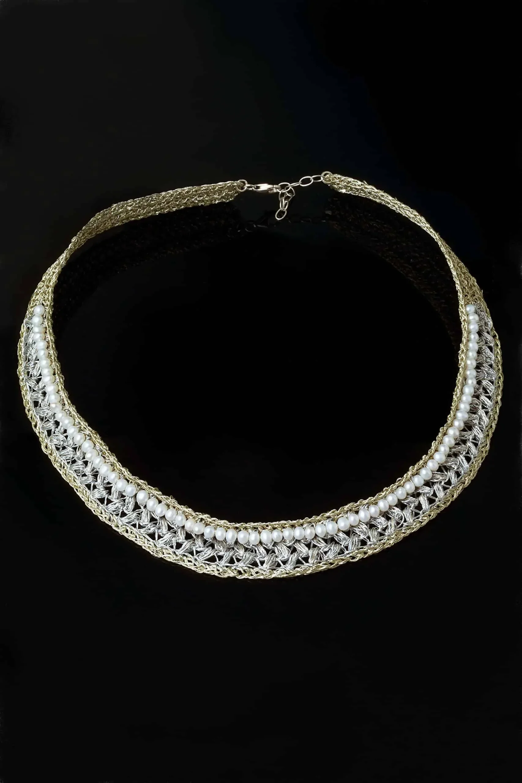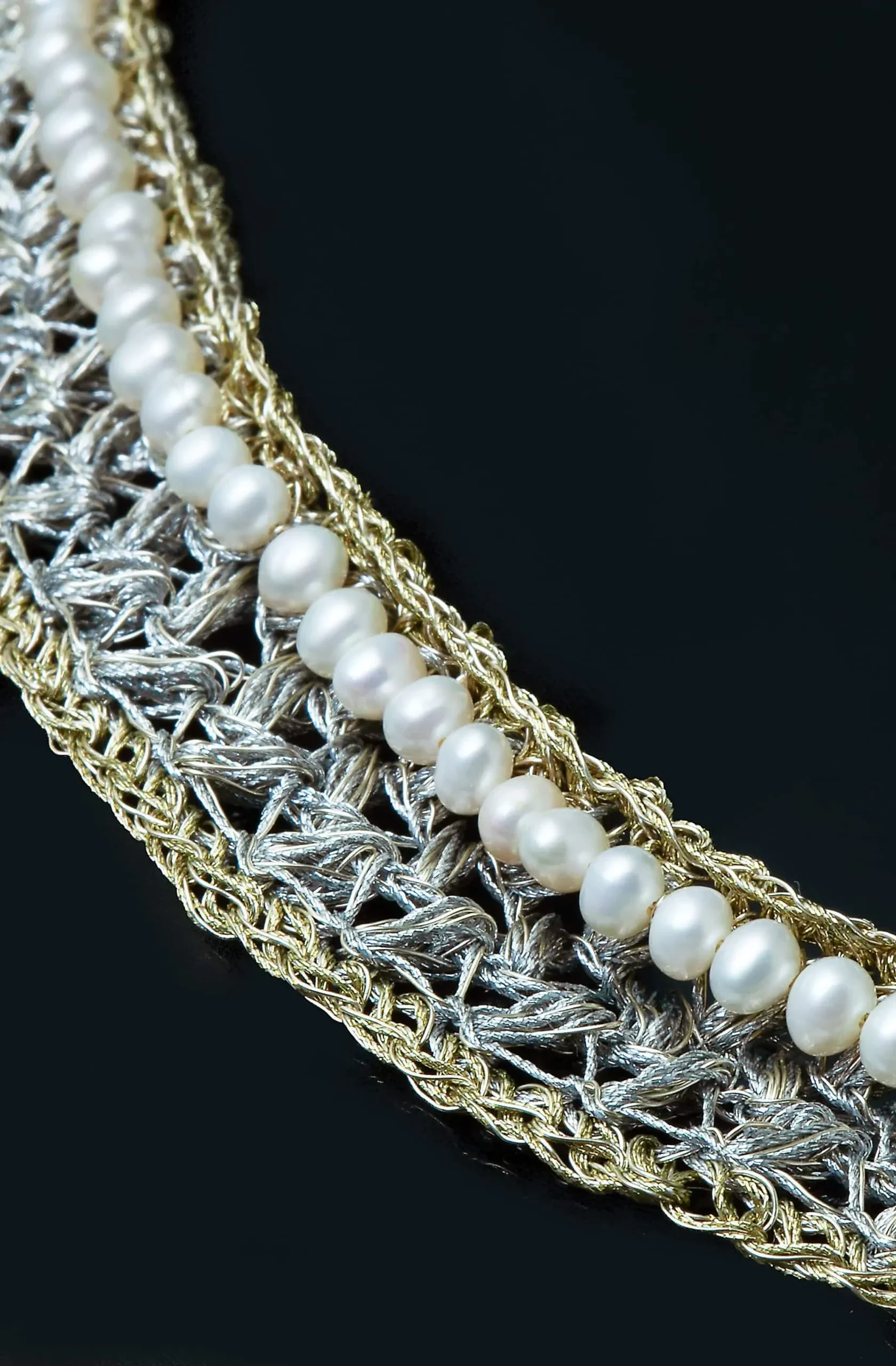 Πλεκτό ασημένιο κολιέ με χρυσόνημα και μαργαριτάρια