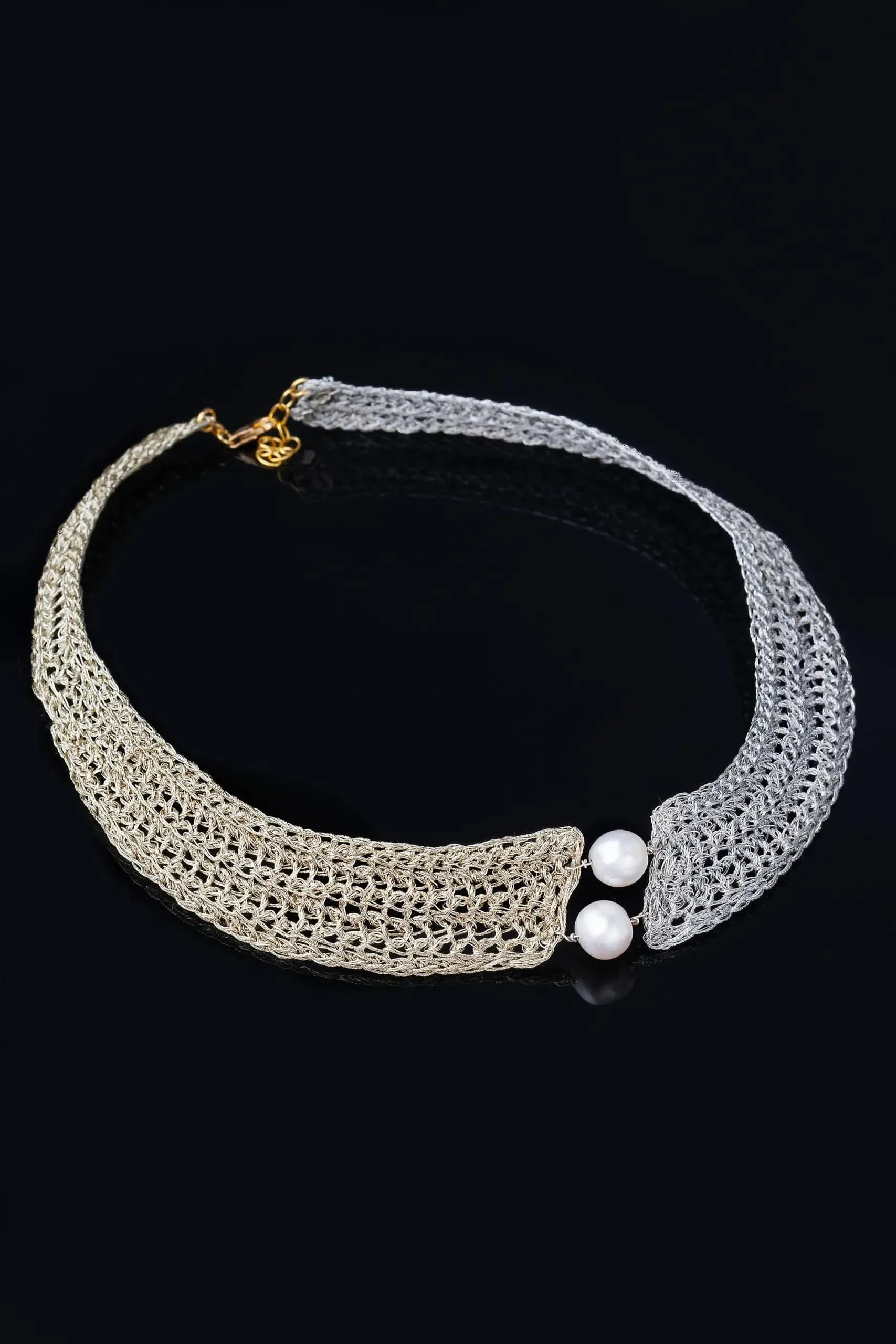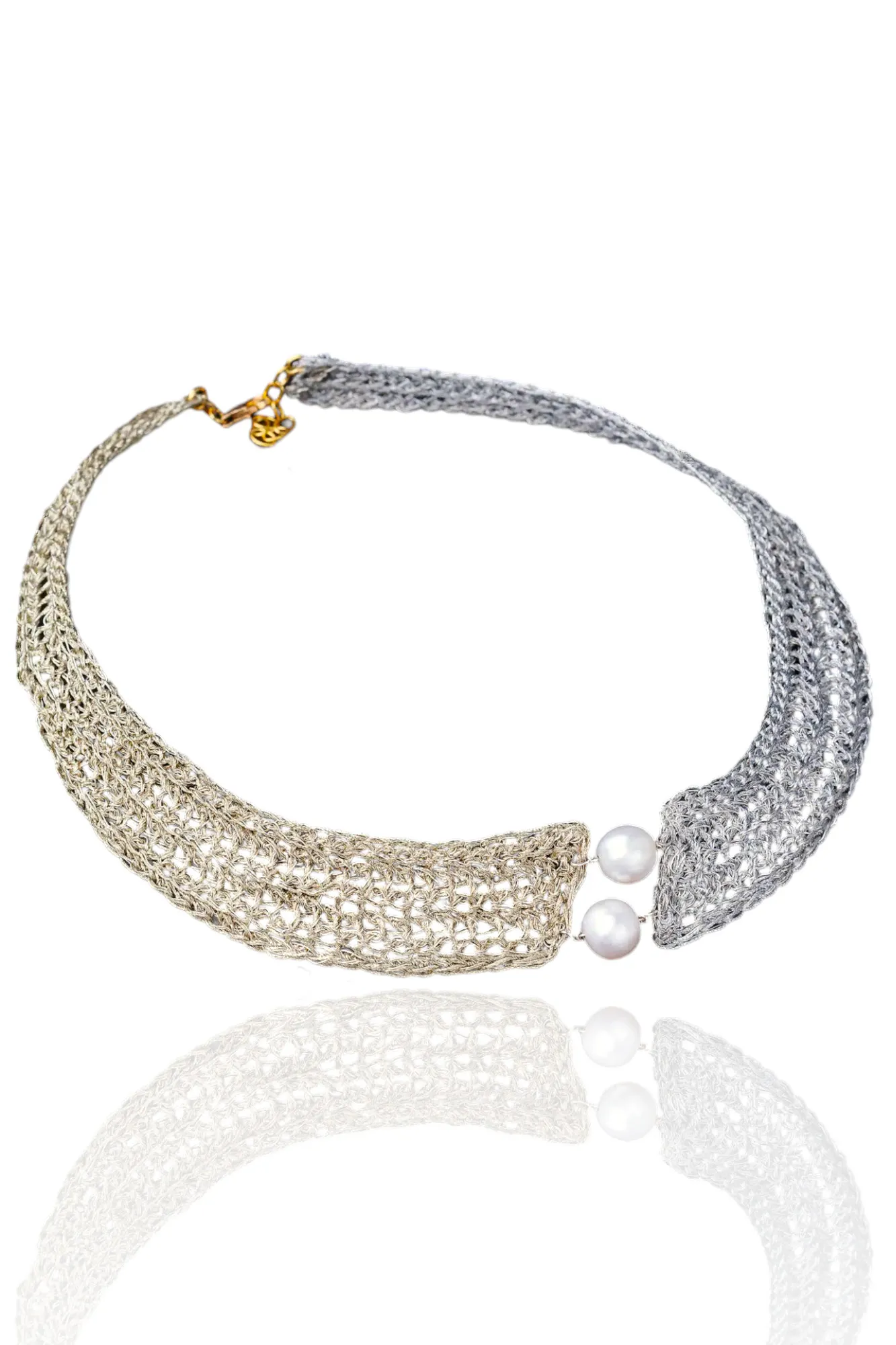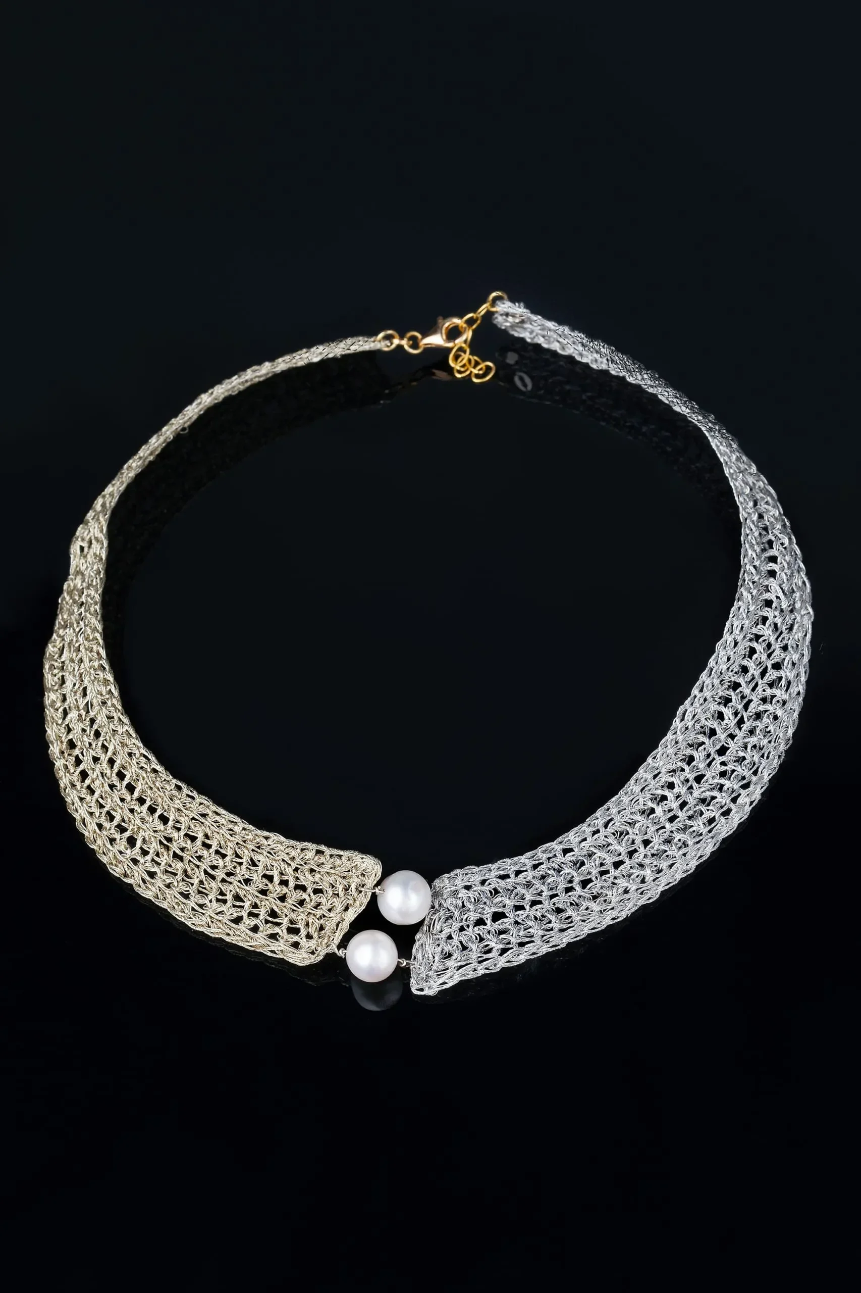 Πλεκτό ασημένιο κολιέ με χρυσόνημα και μαργαριτάρια