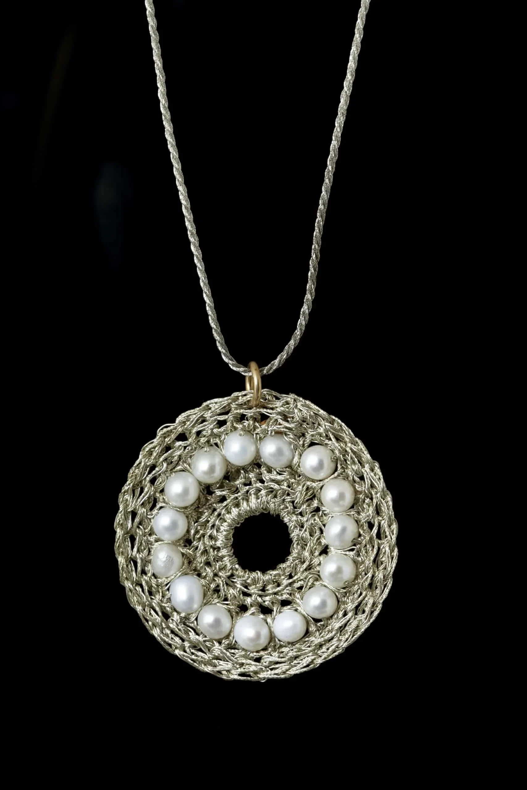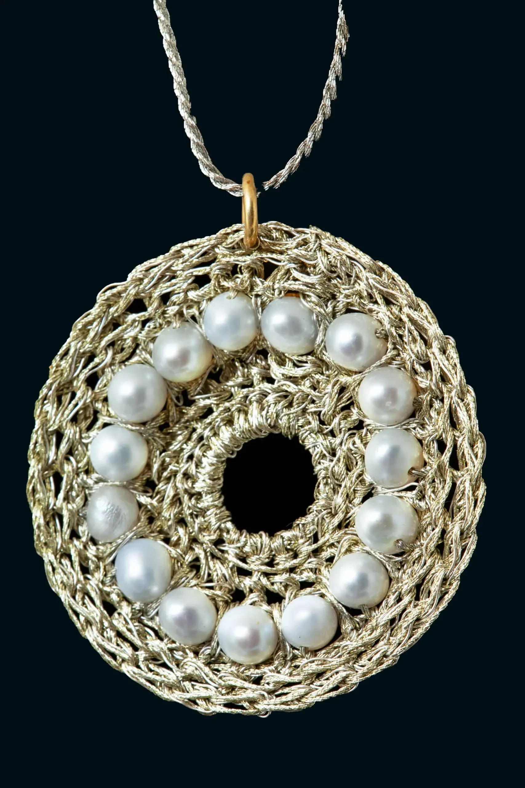 Πλεκτό ασημένιο μενταγιόν με χρυσόνημα και μαργαριτάρια