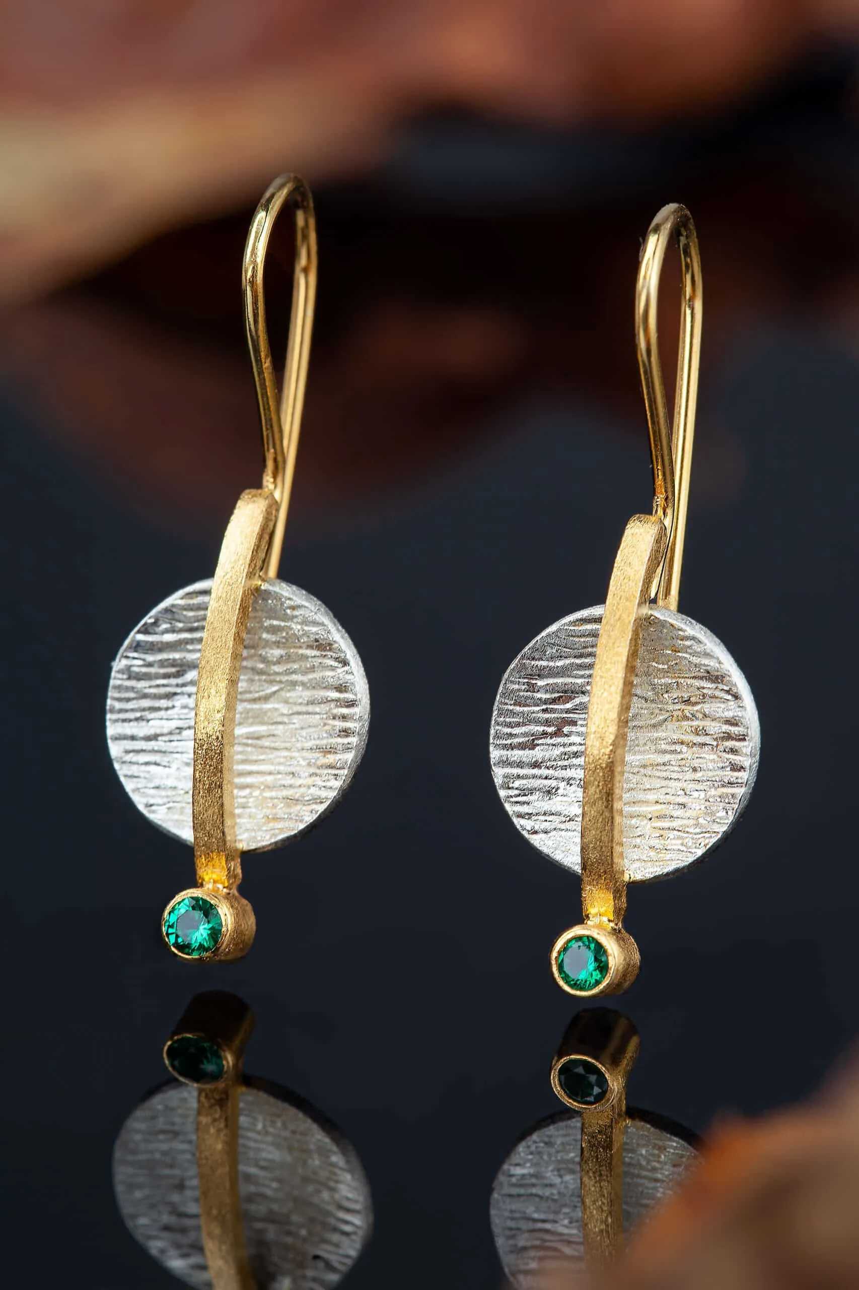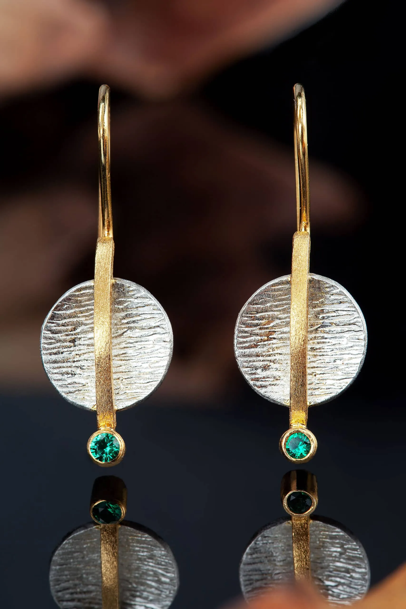 Textured handmade earrings with green zircon