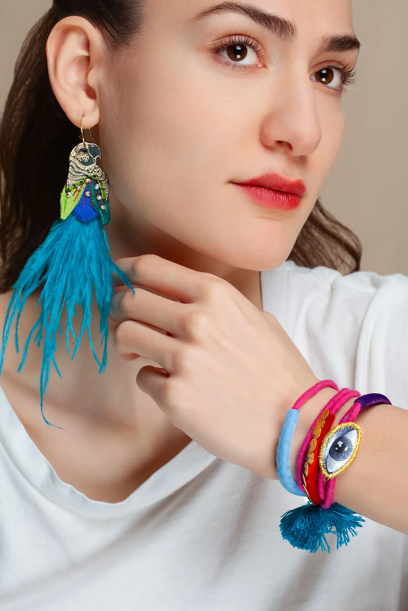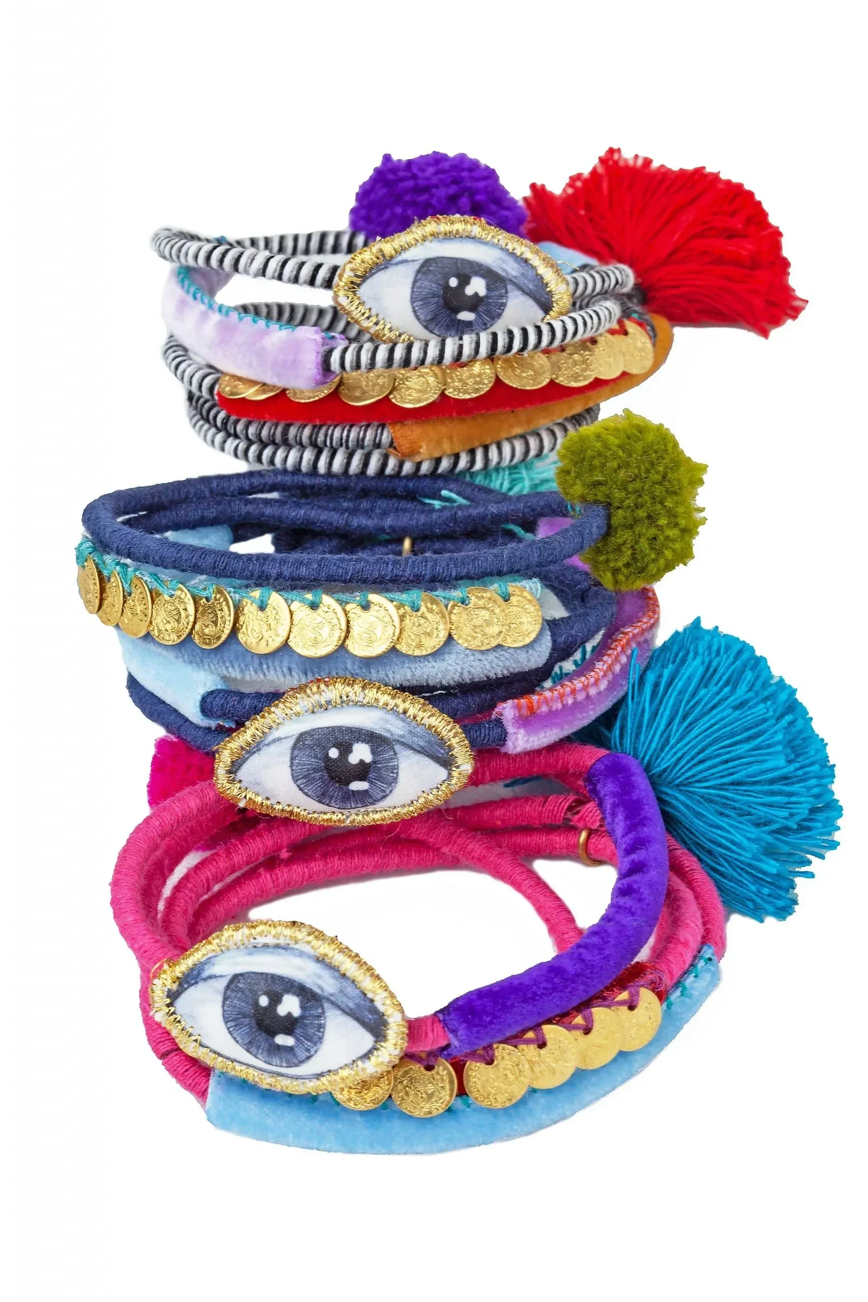 Πεντάσειρο βραχιόλι συνδυασμένο βελούδινα υφάσματα, φλουράκια, και πον πον