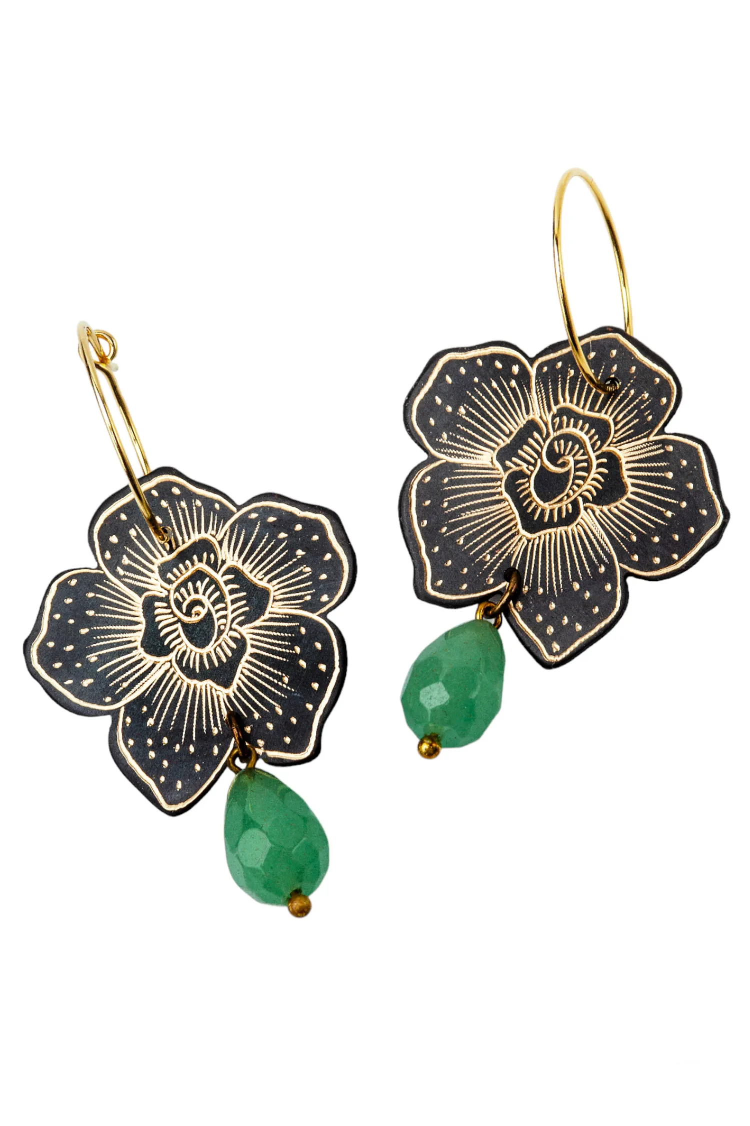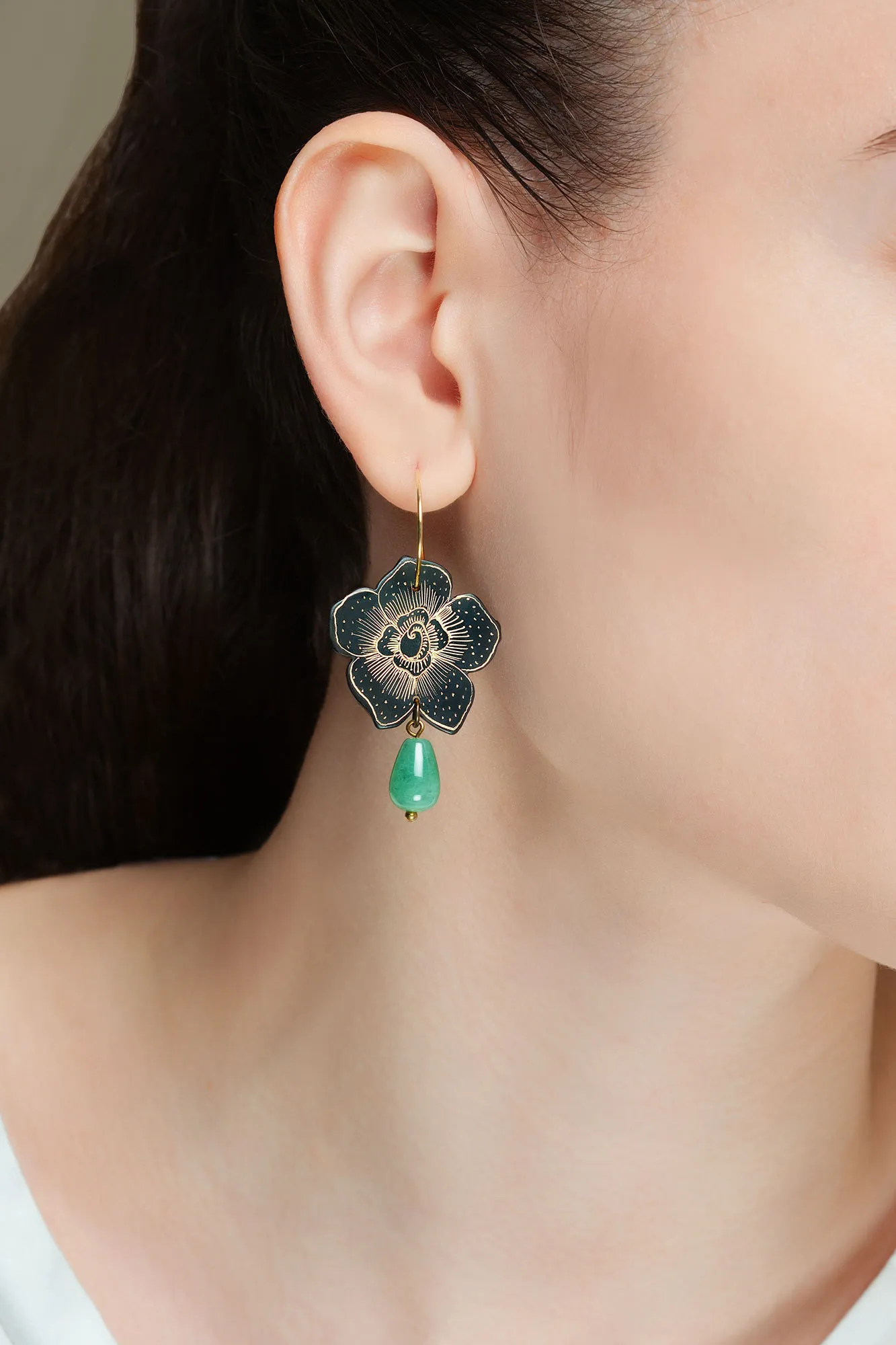 Χαραγμένα σκουλαρίκια λουλούδια από ορείχαλκο με μαύρη επιπλατίνωση συνδυασμένα με μπλε ζάντε σε σχήμα δάκρυ. Οι κρίκοι είναι από επιπλατινωμένο ασήμι 925